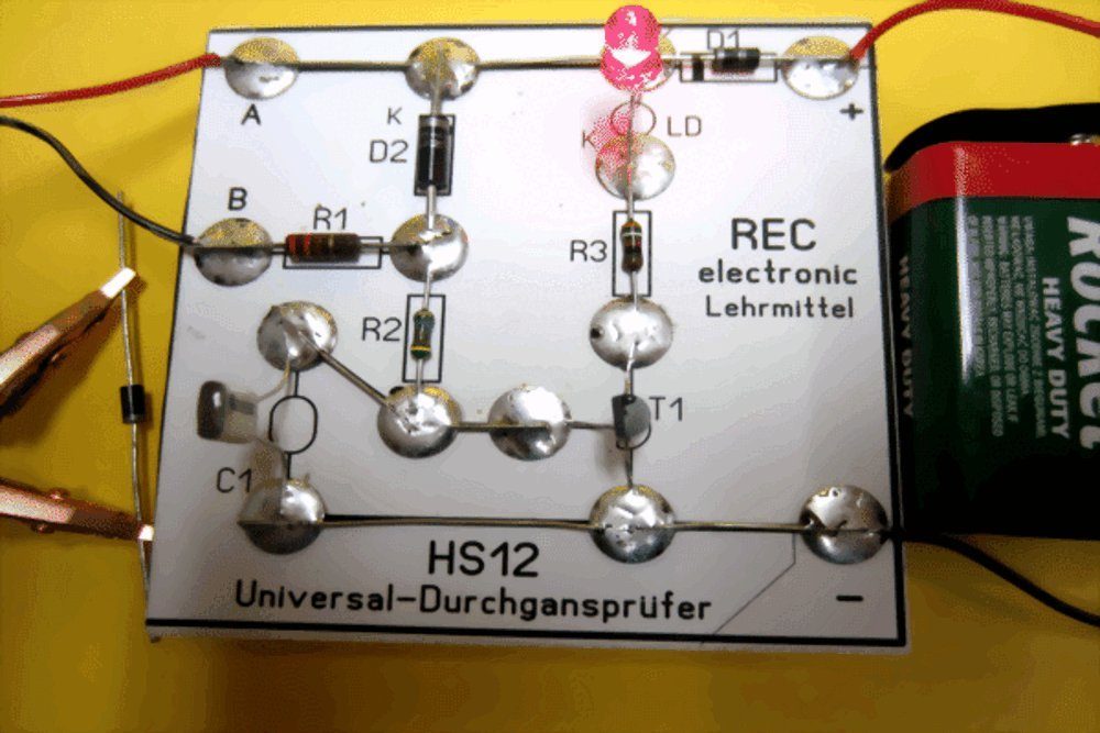 Mehr als nur ein Durchgangsprüfer ist unser Bausatz HS12. Der Durchgangsprüfer ist ein Prüfgerät, das jeder Elektroniker haben muss, und mit dem jeder Schüler umgehen kann. Mit diesem Bausatz kann man elektrischen Durchgang bei Widerständen, Leitungen, Lampen, Spulen, Halbleiter etc. prüfen. Der Universal-Durchgangsprüfer zeigt Durchgang optisch mit einer roten Leichtdiode an.