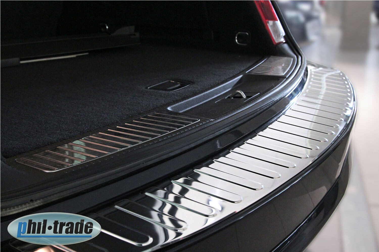 Bitte achten Sie darauf, dass der Ladekantenschutz von Anfang an bündig angesetzt wird. Um ihn mittig anzusetzen können Sie sich am Einraster des Schlosses am Kofferraumboden orientieren. Dieser sollte mit der mittleren Sicke (Prägung) auf dem Ladekantenschutz bündig sein. Anschließend mehrmals Andrücken, fertig!