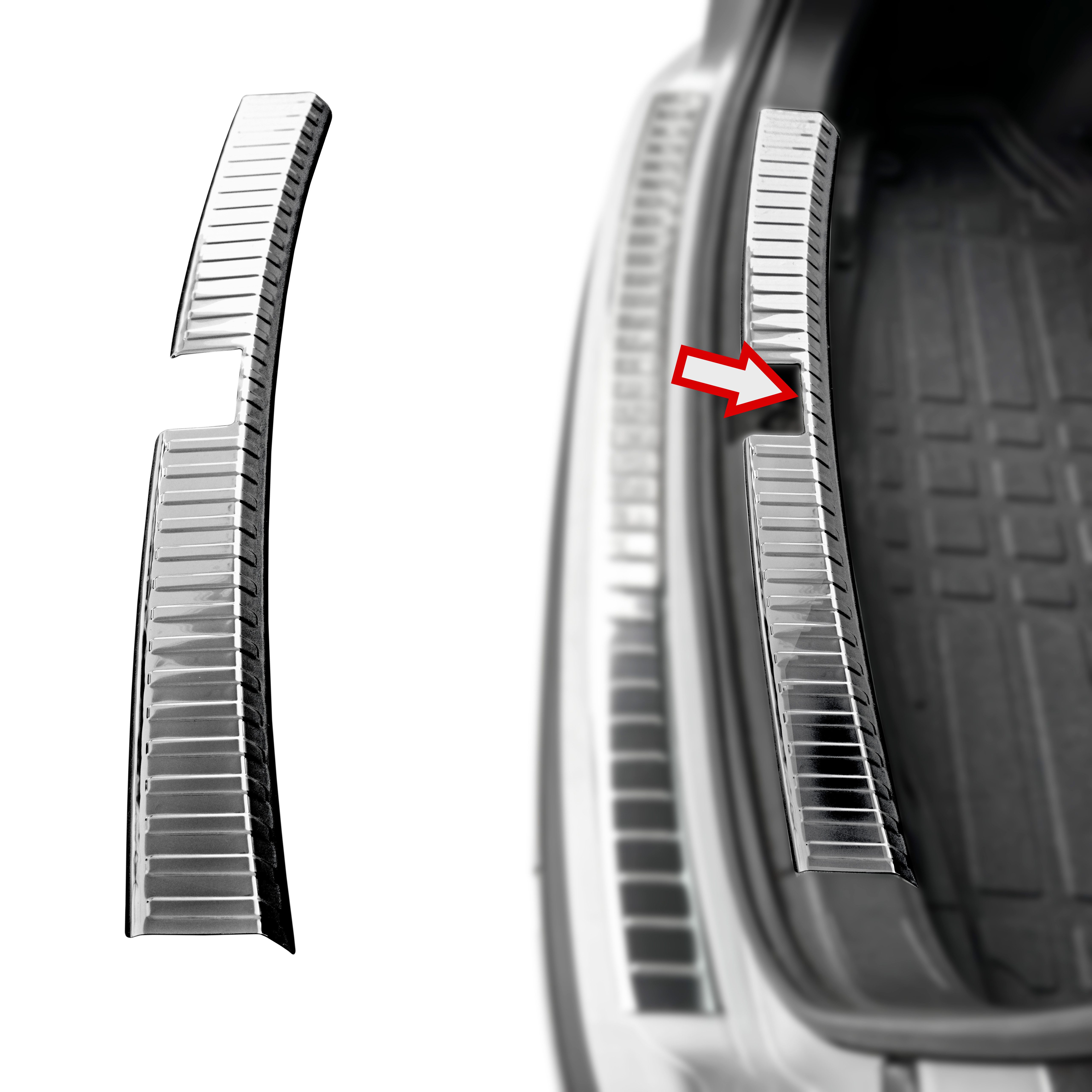Bitte achten Sie darauf, dass der Ladekantenschutz von Anfang an bündig angesetzt wird. Um ihn mittig anzusetzen können Sie sich am Einraster des Schlosses am Kofferraumboden orientieren. Dieser sollte mit der mittleren Sicke (Prägung) auf dem Ladekantenschutz bündig sein. Anschließend mehrmals Andrücken, fertig!