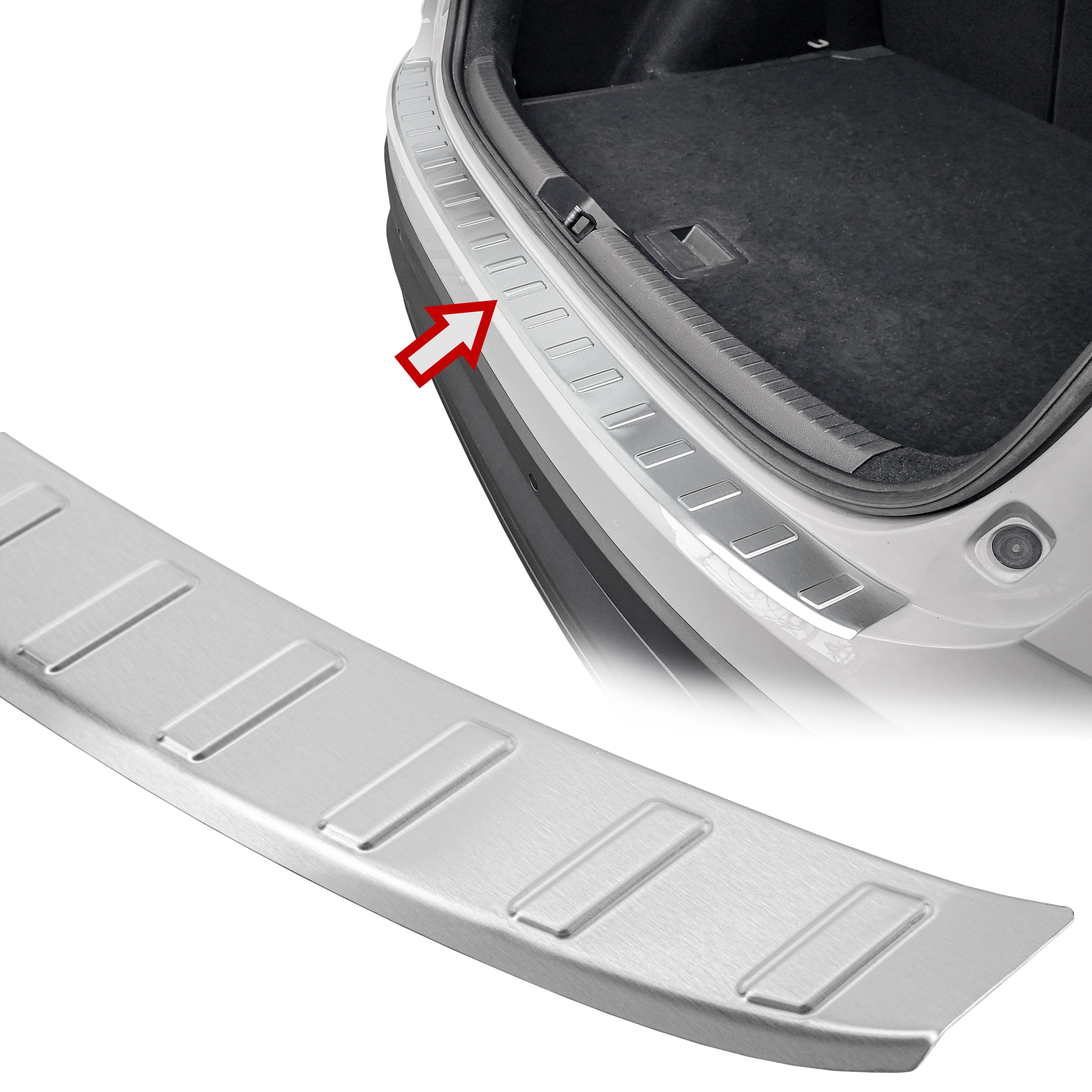 Bitte achten Sie darauf, dass der Ladekantenschutz von Anfang an bündig angesetzt wird. Um ihn mittig anzusetzen können Sie sich am Einraster des Schlosses am Kofferraumboden orientieren. Dieser sollte mit der mittleren Sicke (Prägung) auf dem Ladekantenschutz bündig sein. Anschließend mehrmals Andrücken, fertig!