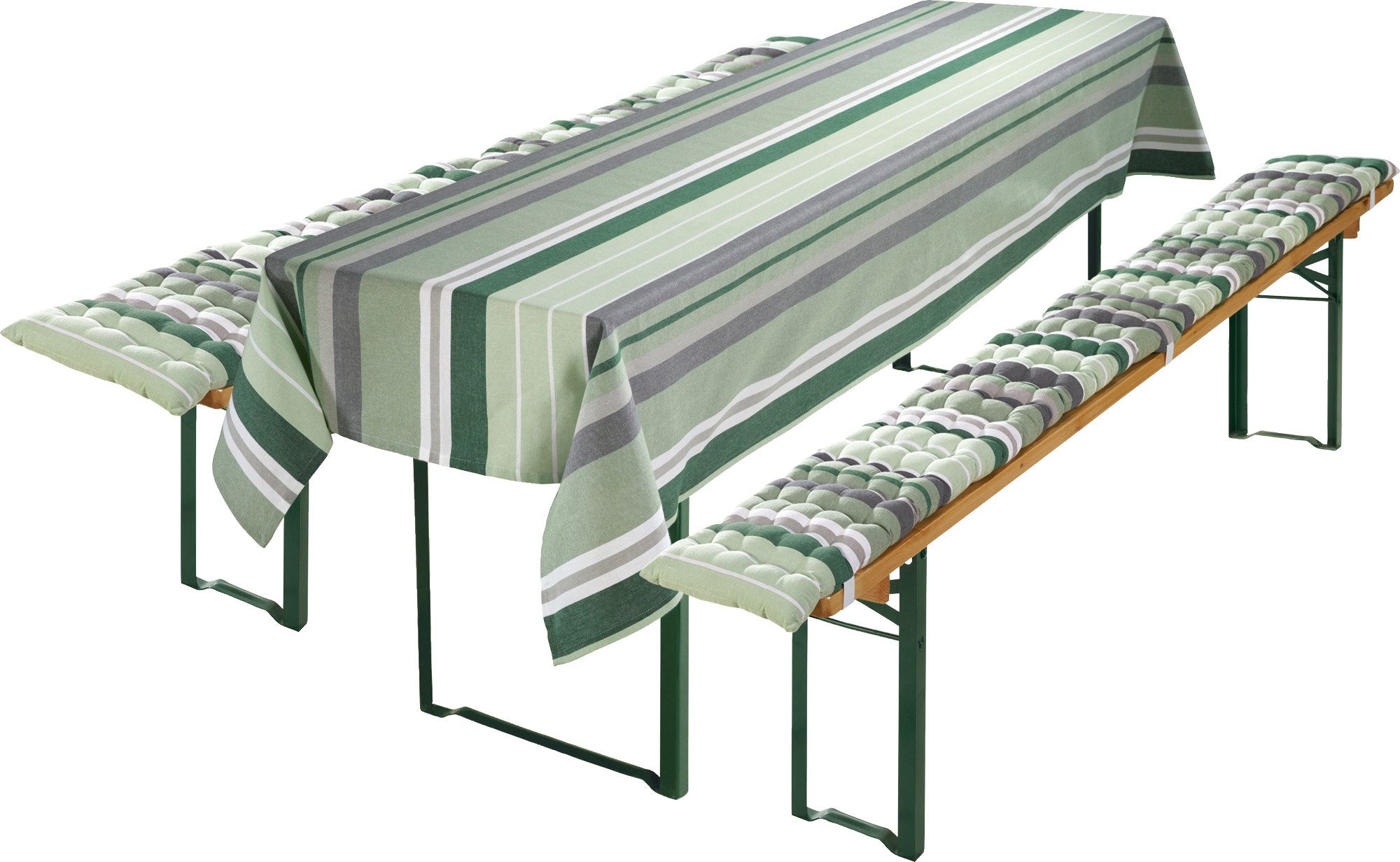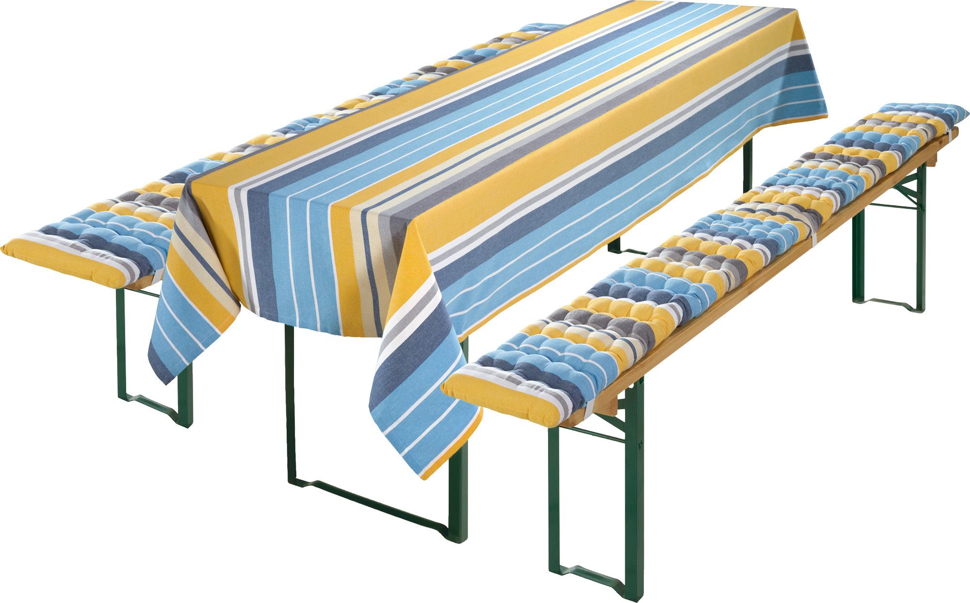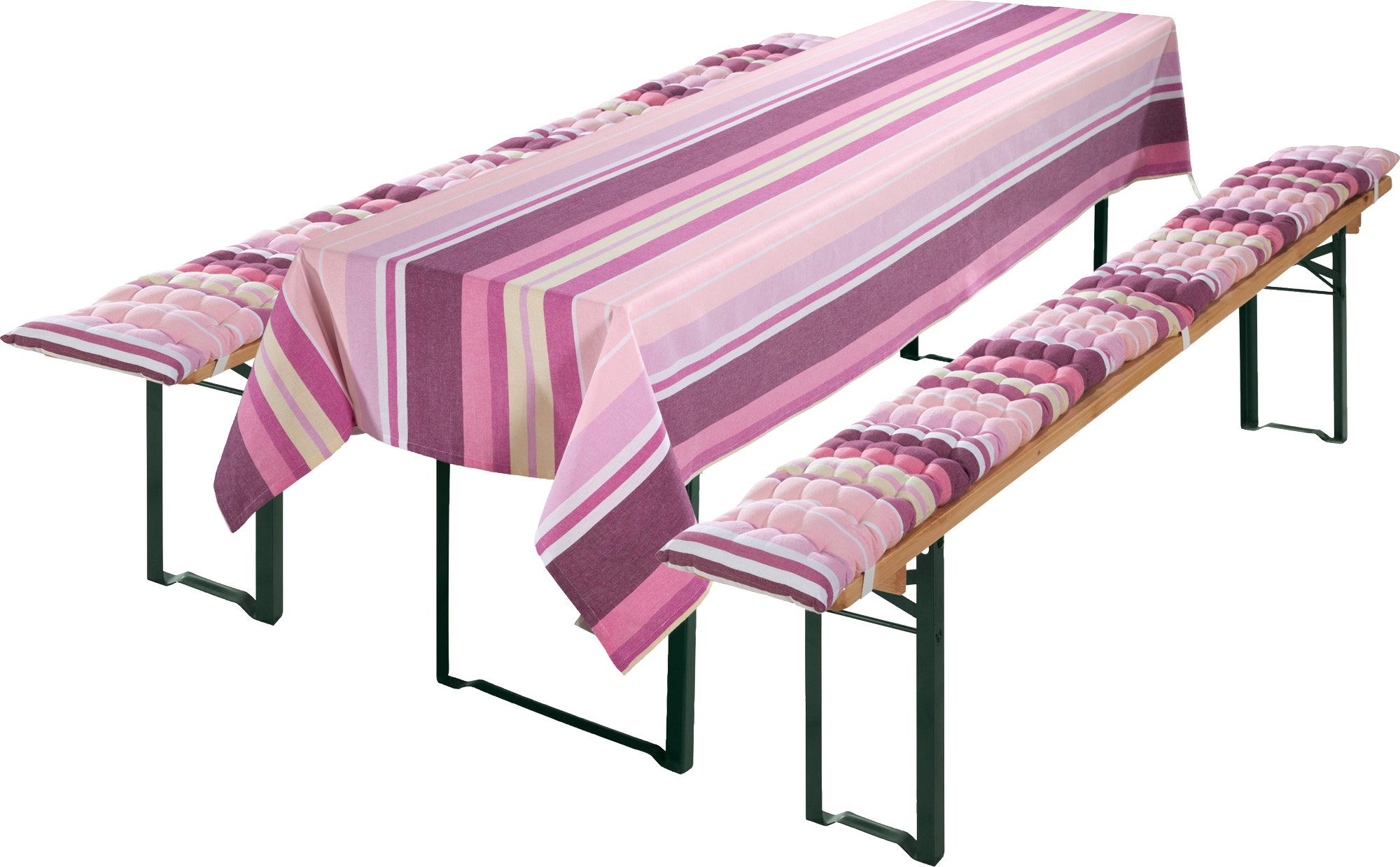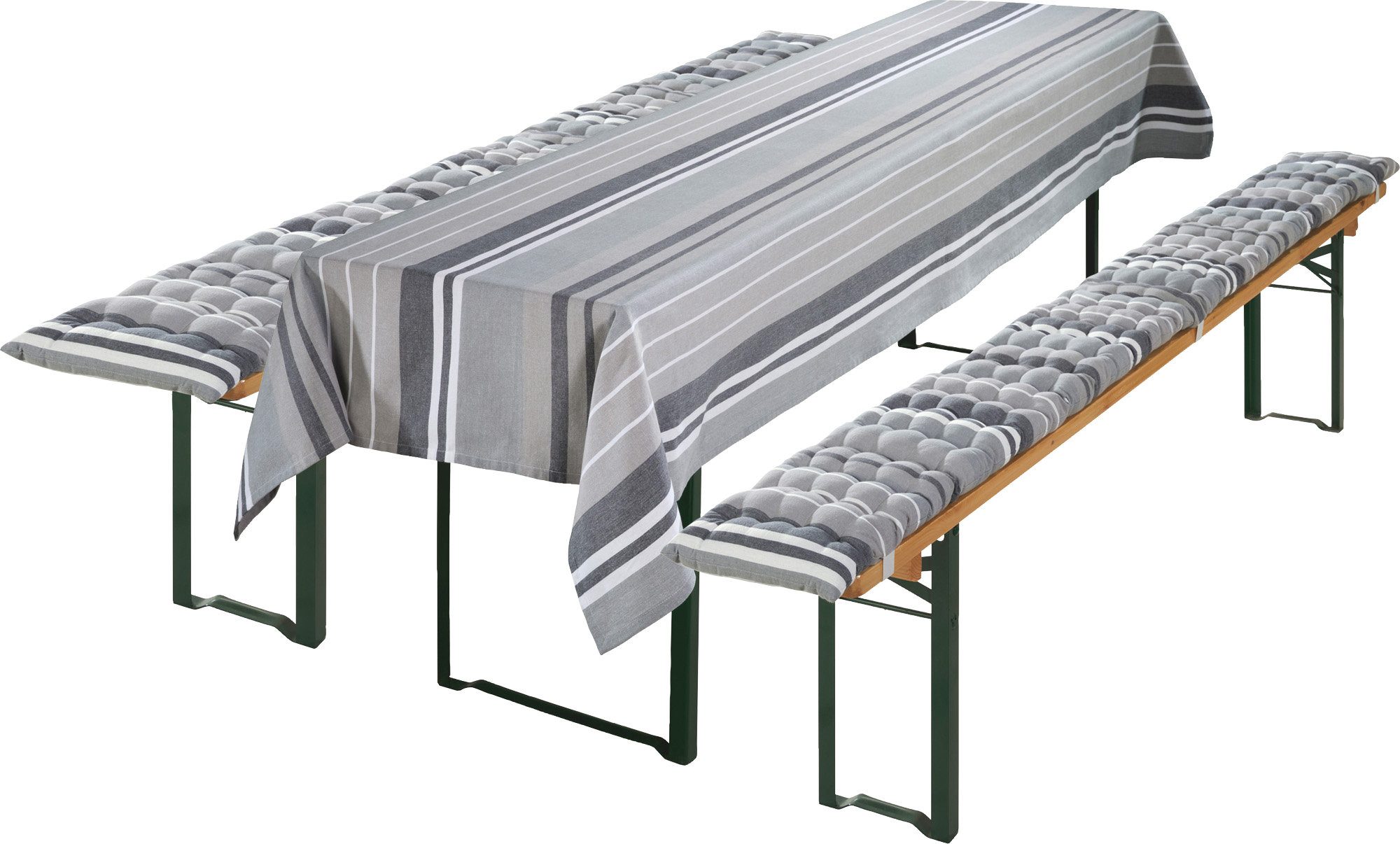 REDBEST Bierbank-Auflagen und Tischdecke im 3-teiligen Set. Mit dieser Serie verpassen Sie Ihrem Zuhause ohne viel Aufwand einen neuen Look. Das buntgewebte Streifenmuster zeigt sich im unterschiedlichen Verlauf, was besonders charmant und erfrischend wirkt. Ob Gartenparty, Geburtstagsfeier oder Grillabend, durch die bequemen 6 cm hohen Auflagen und die passende Tischdecke wird die rustikale Biertisch-Garnitur einladend und gemütlich. Die Auflagen sind weich mit Polyester gefüllt, versteppt und lassen sich durch elastische Gummibänder einfach befestigen. Oberstoff aus robustem, glattem Gewebe, strapazierstark und langlebig.