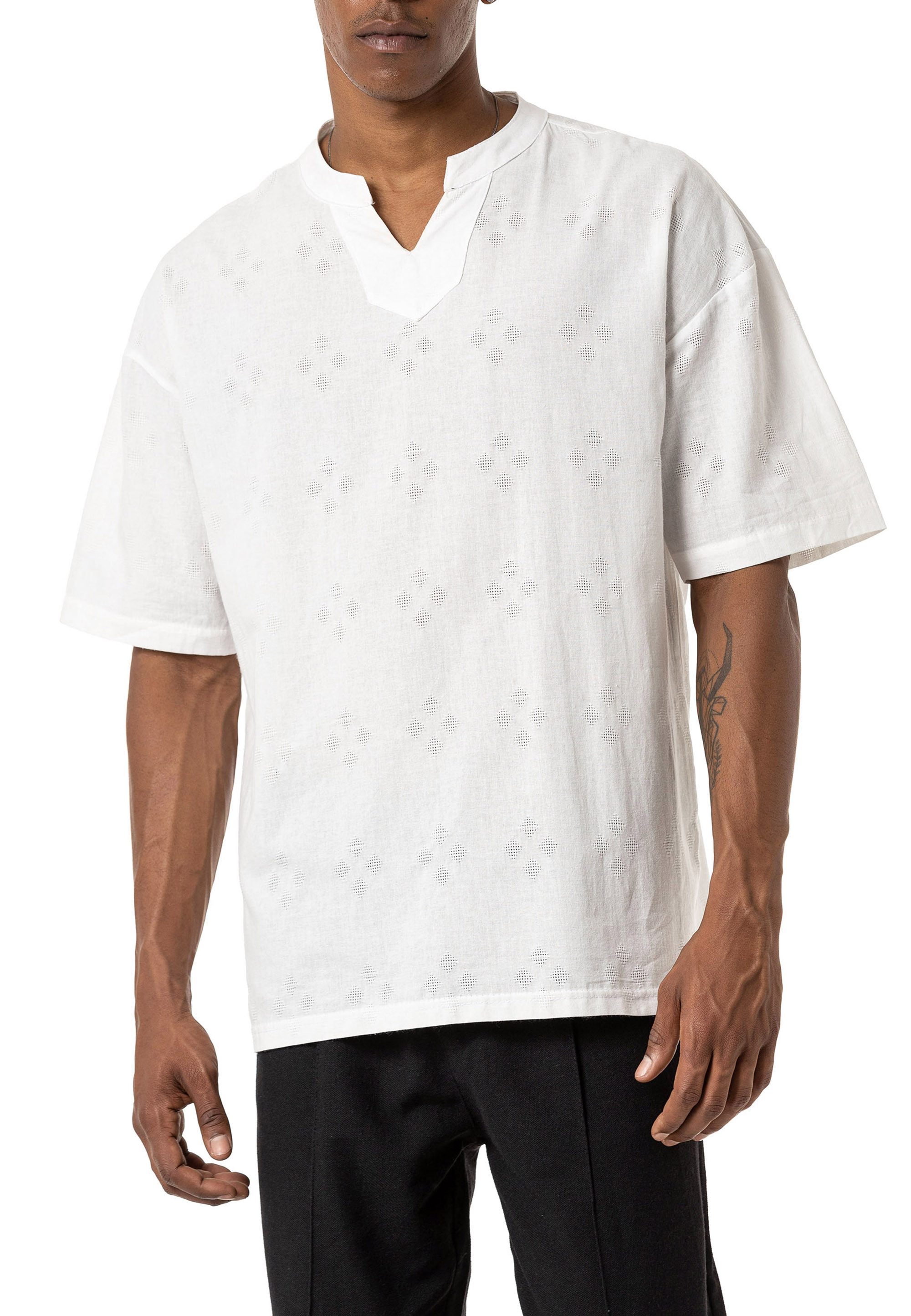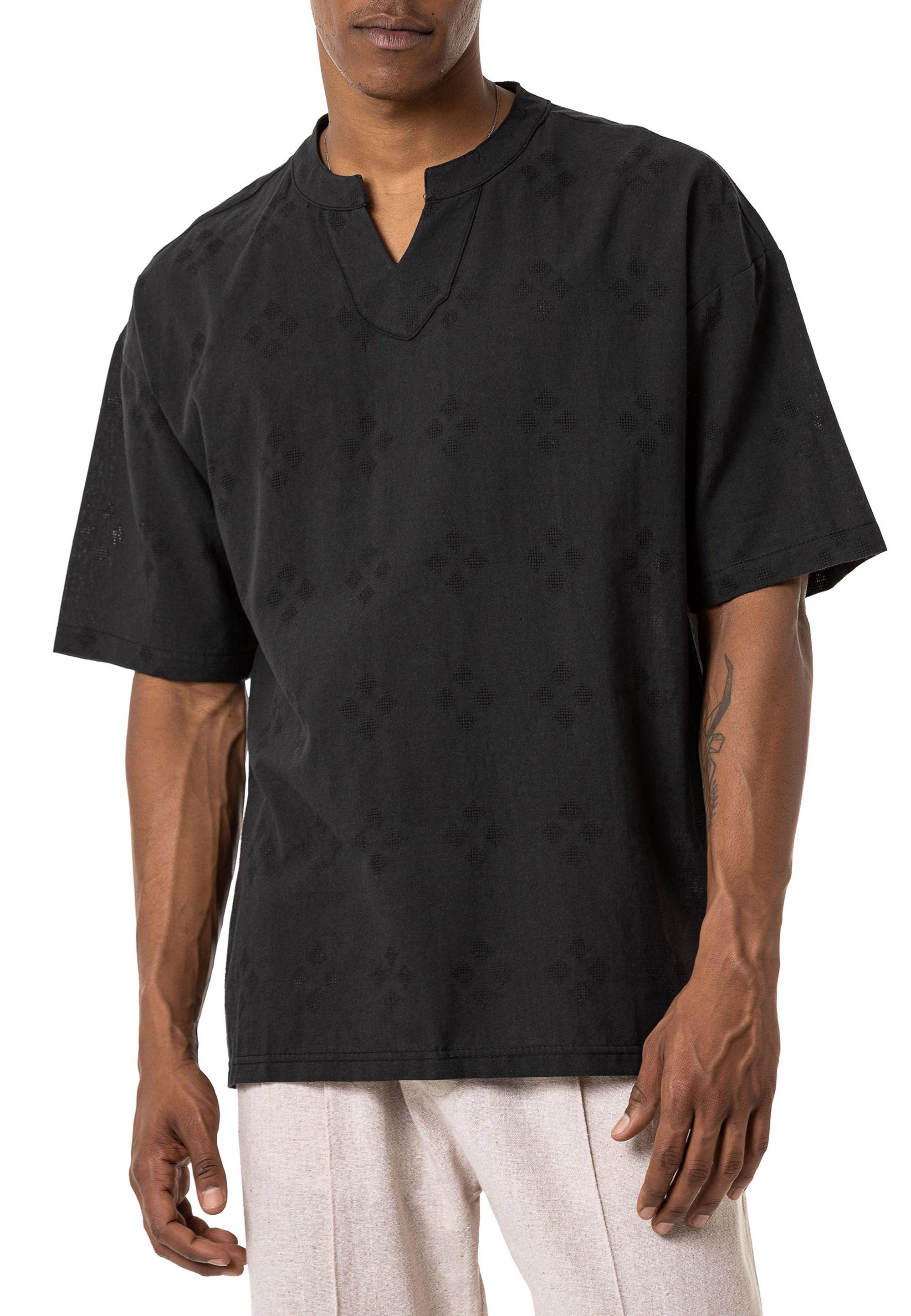Dieses Oversized-Shirt mit einzigartigem Cut-Out-Ausschnitt und dezentem Ton-in-Ton-Muster setzt stylische Akzente für einen modernen Look. Die lockere Passform sorgt für ein entspanntes Tragegefühl und macht es zum perfekten Begleiter für den Alltag. Hergestellt aus 100 % hochwertiger Baumwolle, bietet das Shirt Atmungsaktivität und ein weiches Hautgefühl. Die kurzen Ärmel und der Oversized-Schnitt garantieren maximale Bewegungsfreiheit und eine lässige Silhouette. Das raffinierte Ton-in-Ton-Muster unterstreicht den stilvollen Charakter des Shirts und macht es zu einem echten Hingucker. Ob mit Jeans, Jogginghosen oder Shorts kombiniert – dieses Shirt verleiht jedem Outfit eine moderne Note. Perfekt für Streetwear-Fans und Modeliebhaber, die Wert auf Komfort und stilvolles Design legen. Hol dir jetzt dieses angesagte Oversized-Shirt und bring frischen Wind in deine Garderobe!