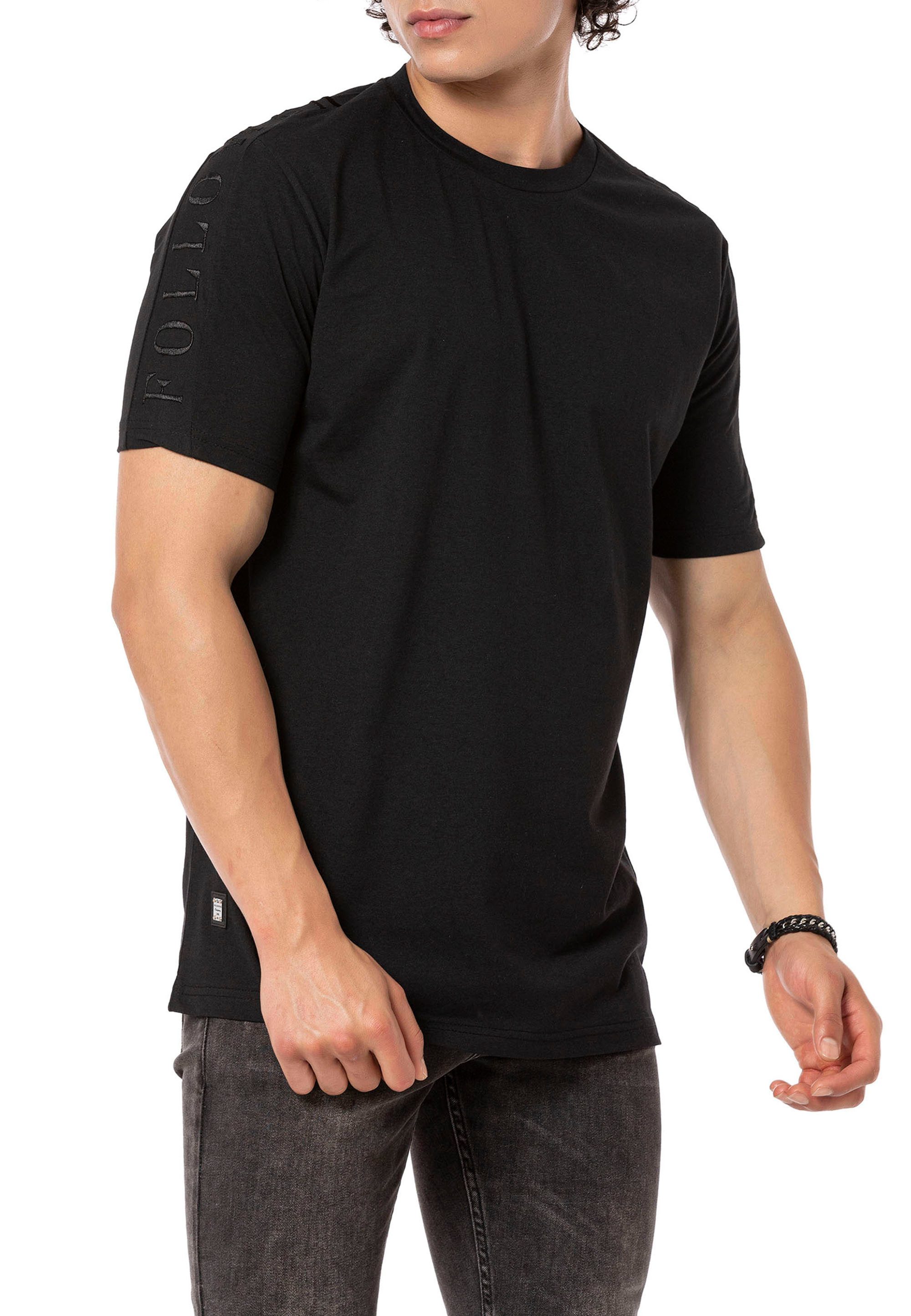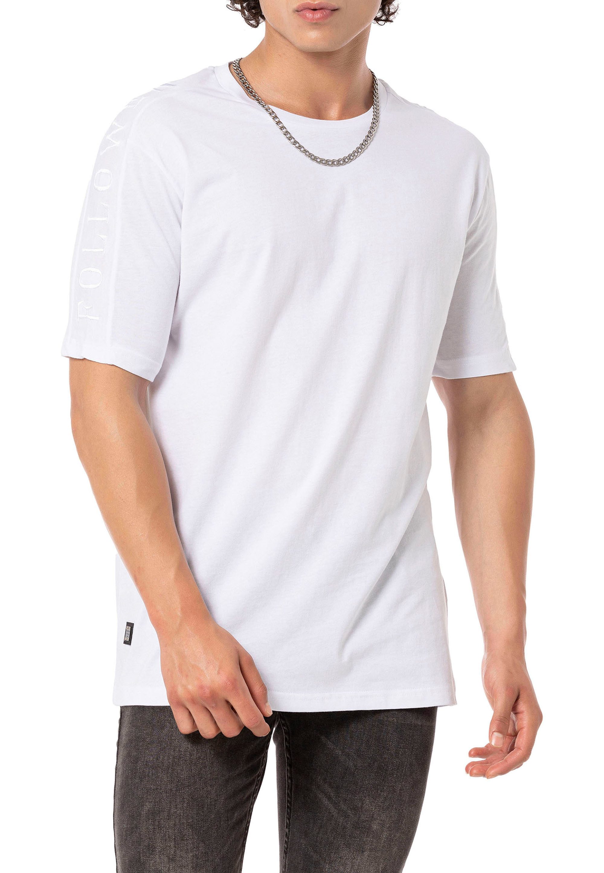 Modernes Oversized-T-Shirt mit dezentem Schriftzug auf den Ärmeln für einen minimalistischen Streetwear-Look.