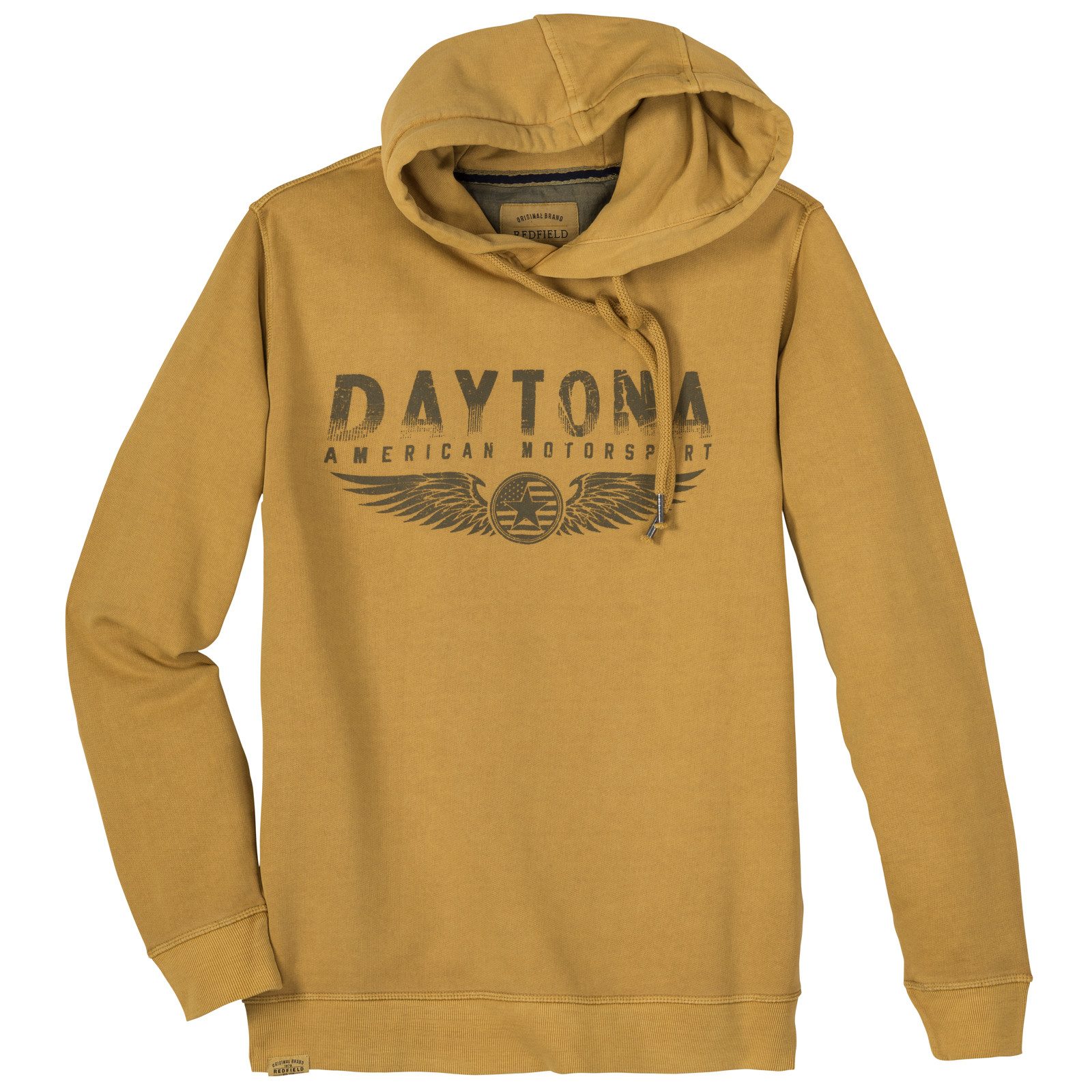 Optisch überzeugt der Hoodie in Ocker mit einem markanten Frontprint „Daytona – American Motorsport“ im Used-Look. Die Kapuze mit Kordelzug unterstreicht den lässigen Charakter, während die elastischen Bündchen an Ärmeln und Saum für optimalen Sitz und Formstabilität sorgen.
