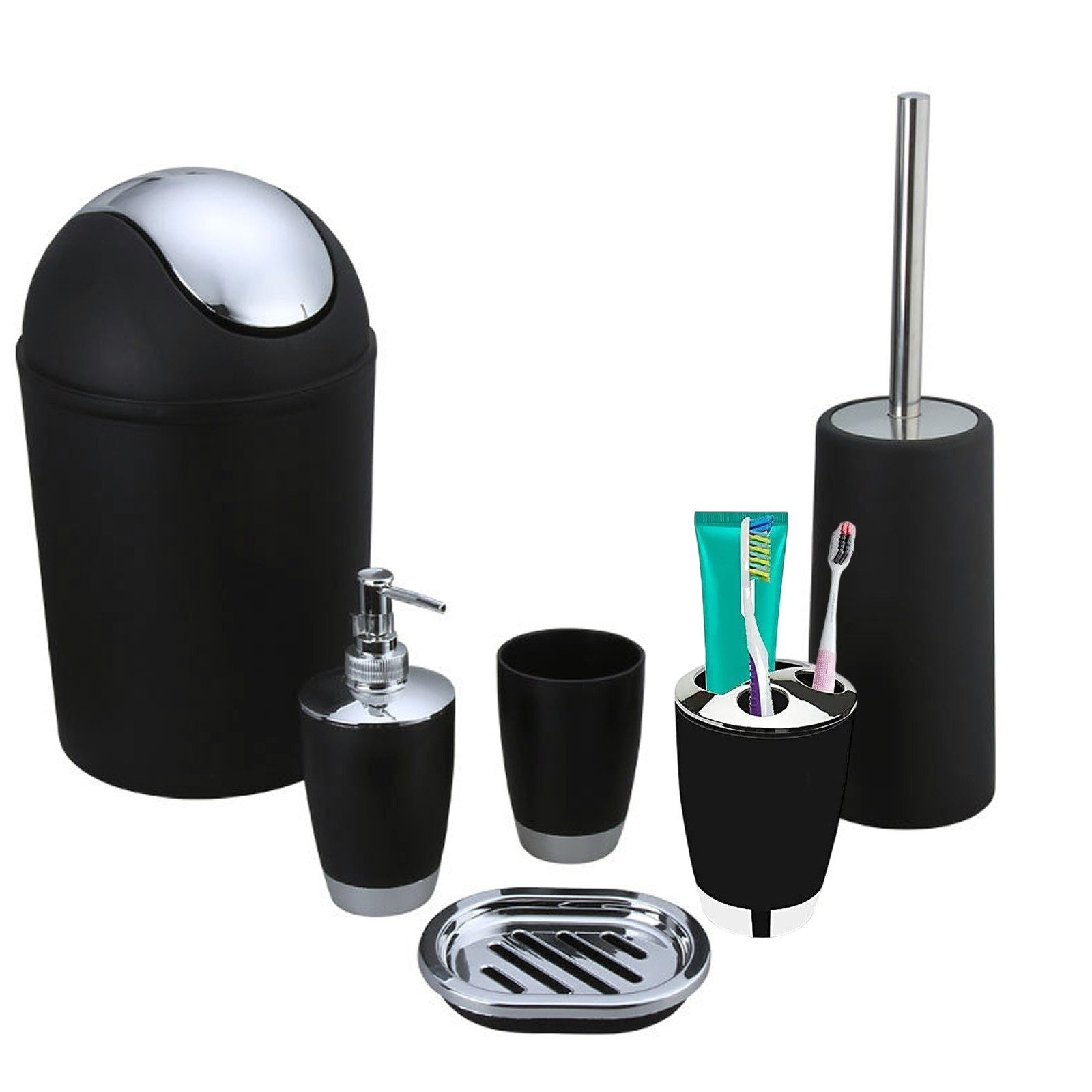 Das Set umfasst einen Zahnpastenspender, einen Becher für Mundspüllösung, einen Becher für zwei Zahnbürsten, einen Seifenhalter, eine Toilettenbürste und einen kleinen Mülleimer. So sind Ihre Utensilien stets geordnet und griffbereit.
