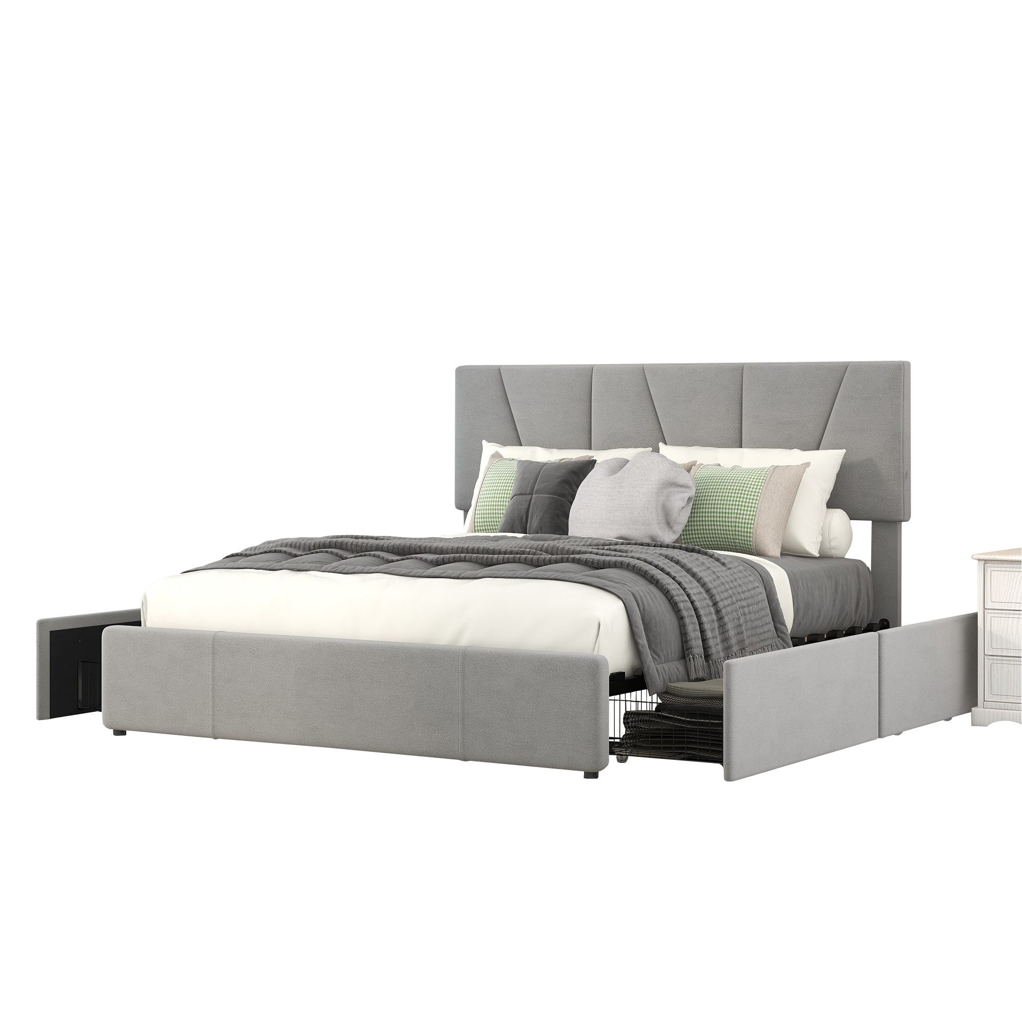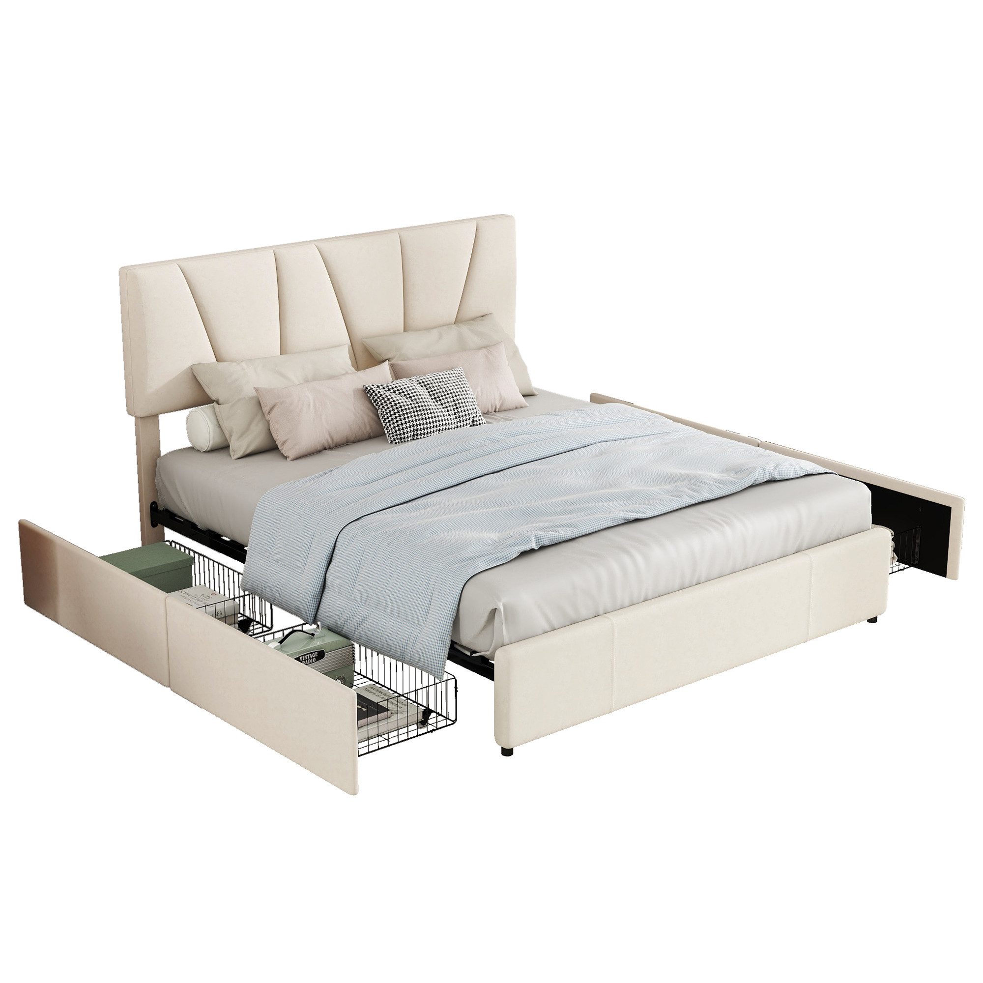Dieses Polster Plattformbett (140x200cm) kombiniert modernes Design mit praktischer Funktionalität. Die vier Schubladen bieten viel Stauraum für Kleidung und Bettwäsche, ideal für kleine Räume oder als platzsparende Lösung in Apartments. Der stabile Rahmen aus Kiefernholz und MDF sorgt für hohe Stabilität und eine Tragfähigkeit von bis zu 220 kg.