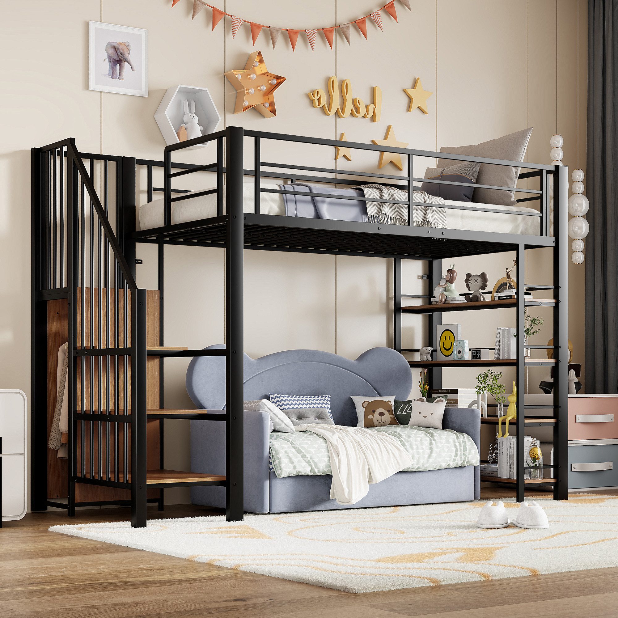 Sicherheit für Ihr Kind: Das Hochbett bietet eine praktische Sicherheitstreppe mit rutschfesten Stufen, die einen sicheren Zugang zum oberen Bereich gewährleisten. Besonders für Kinder ist Sicherheit im Schlafzimmer wichtig – der hohe Zaun um das Bett sorgt dafür, dass Ihr Kind sicher schläft und keine Gefahr von Stürzen besteht.