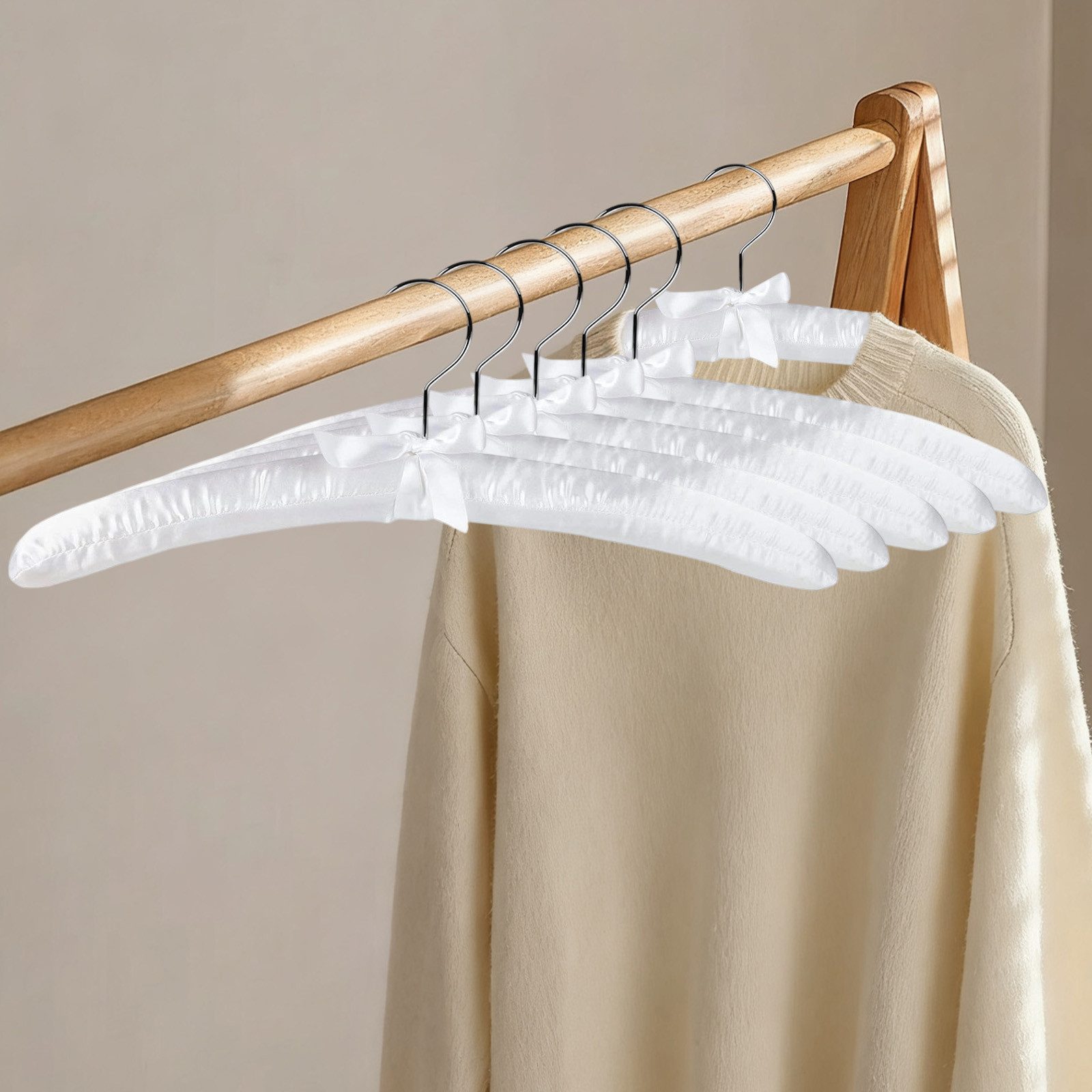 Die Oberfläche der Kleiderbügel ist mit glattem Satin überzogen, der ein angenehmes Gefühl vermittelt und gleichzeitig Eleganz in den Kleiderschrank bringt. Ein dekoratives Satinband verleiht jedem Bügel eine besonders stilvolle Note. Ihre Kleidung bleibt makellos und wird weder zerkratzt noch beschädigt.