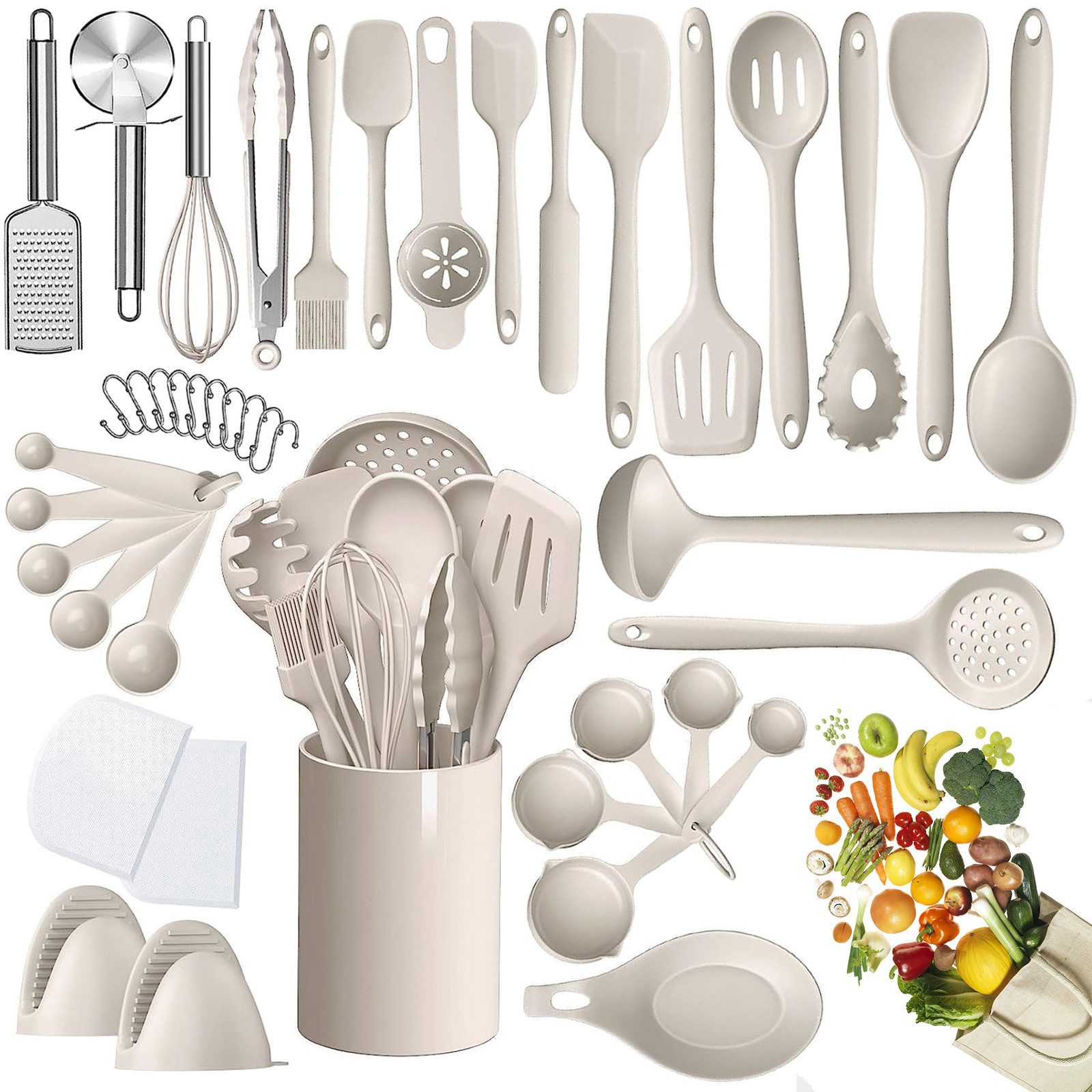 Enthält Spatel, Löffel und weitere praktische Helfer in verschiedenen Größen und Formen.