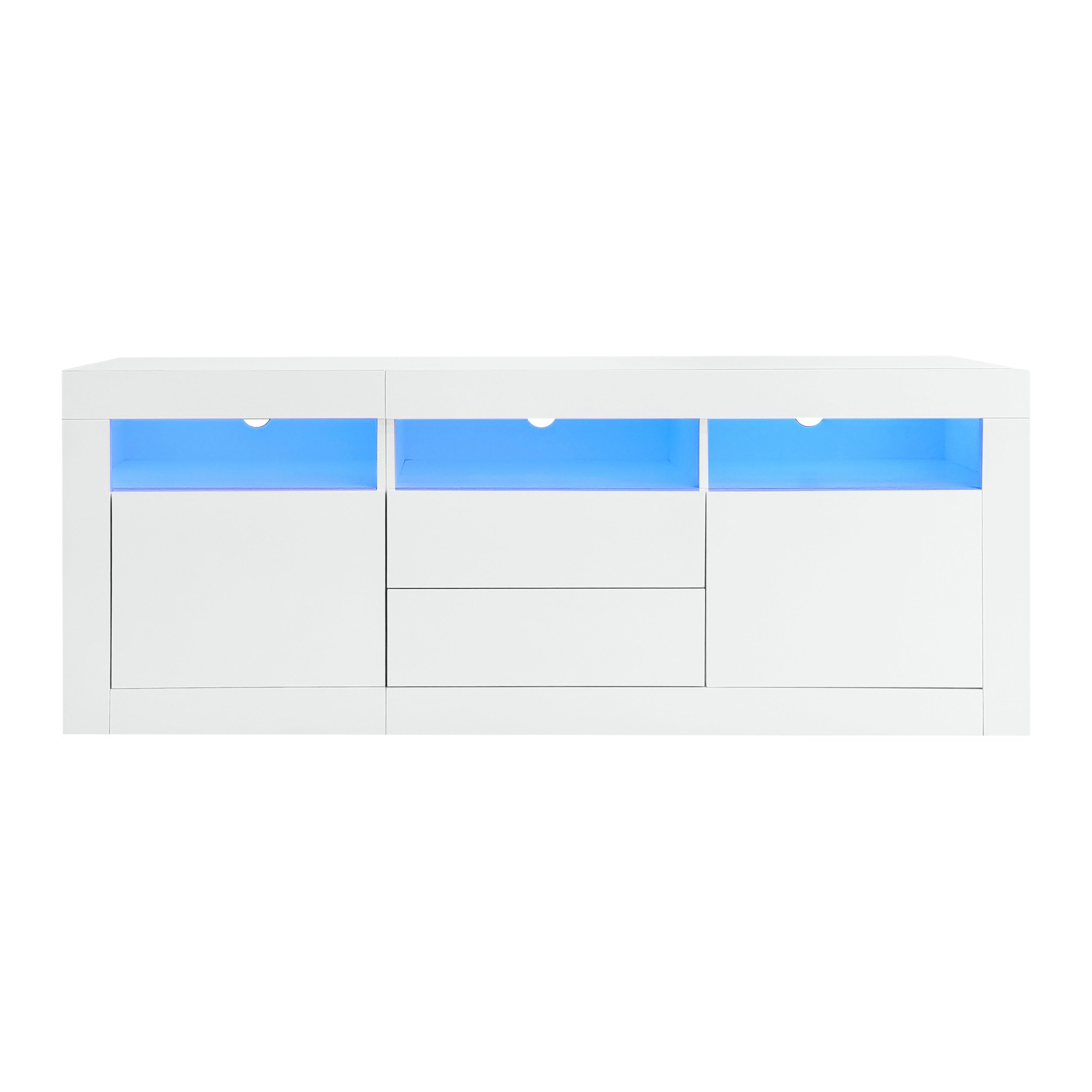 Der moderne Hochglanz-TV-Schrank von REDOM (160 x 35 x 60 cm) vereint elegantes Design mit hoher Funktionalität und macht Ihr Wohnzimmer zum perfekten Entertainment-Bereich. Die glatte Hochglanz-Oberfläche besticht durch ihre edle Optik und pflegeleichte Reinigung. Drei offene Fächer bieten Platz für Multimedia-Geräte wie Spielekonsolen oder Receiver, jeweils mit Kabeldurchführung für ordentliches Kabelmanagement. Zwei Türen und zwei Schubladen mit Push-to-Open-System sorgen für zusätzlichen Stauraum bei minimalistischem Design ohne sichtbare Griffe. Die integrierte LED-Beleuchtung ist via Bluetooth-App steuerbar und ermöglicht individuelle Anpassung von Farbe, Helligkeit und Farbtemperatur. Die Musiksteuerungsfunktion der LEDs schafft eine besondere Atmosphäre, die sich an den Takt Ihrer Lieblingsmusik anpasst. Gefertigt aus robusten Spanplatten garantiert der TV-Schrank Stabilität und lange Lebensdauer. Die einfache Montage wird durch eine detaillierte Anleitung unterstützt. Dieses Möbelstück verbindet Stil und Technik und ist eine wertvolle Ergänzung für jedes moderne Zuhause.