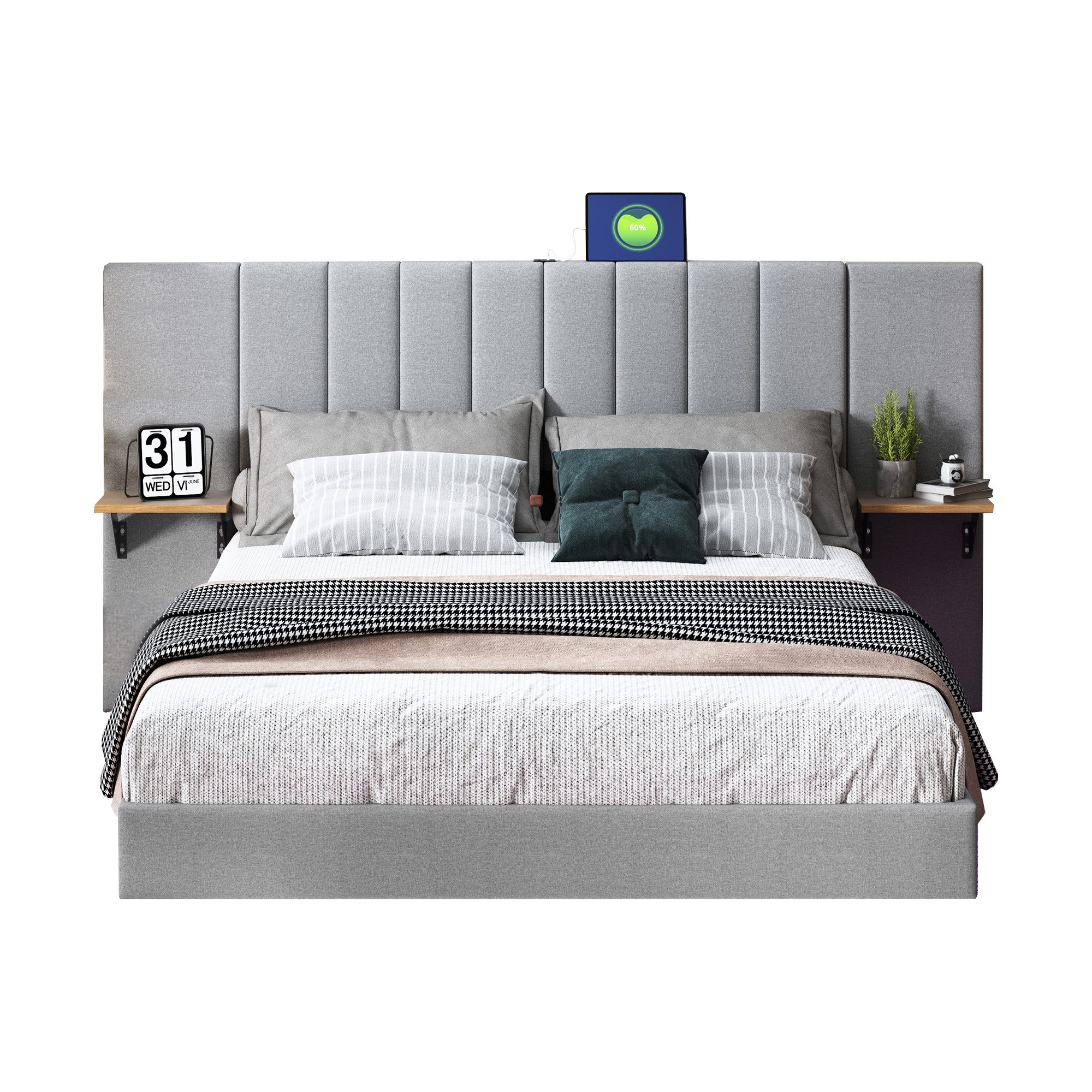 Dieses Polsterbett ist nicht nur ein Ort zum Schlafen, sondern auch eine praktische Lösung für moderne Bedürfnisse. Das Kopfteil ist mit beidseitigen Ablageflächen und Regalhaltern ausgestattet, die ausreichend Platz für Bücher, Wecker oder andere wichtige Utensilien bieten. Ein integrierter USB-Ladeanschluss sorgt dafür, dass Ihre elektronischen Geräte bequem aufgeladen werden können, während Sie sich ausruhen. Zusätzlich verfügt das Bett über einen LED-Farbwechselstreifen unter dem Rahmen, der per Fernbedienung oder Smartphone gesteuert werden kann, um das perfekte Ambiente in Ihrem Schlafzimmer zu schaffen.