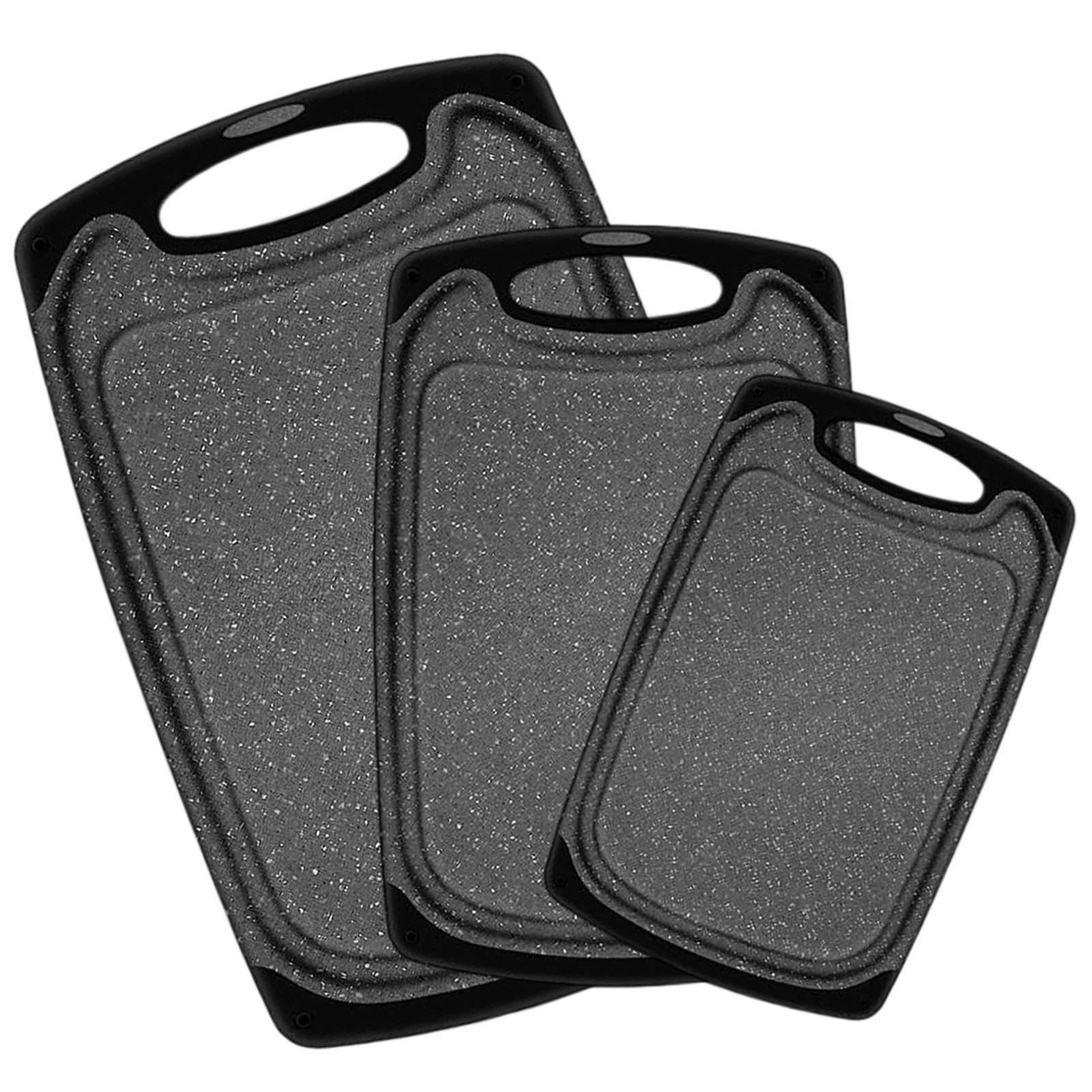 Das REDOM Schneidebrett-Set besteht aus hochwertigem, hitzebeständigem Kunststoff und rutschfestem Silikon.