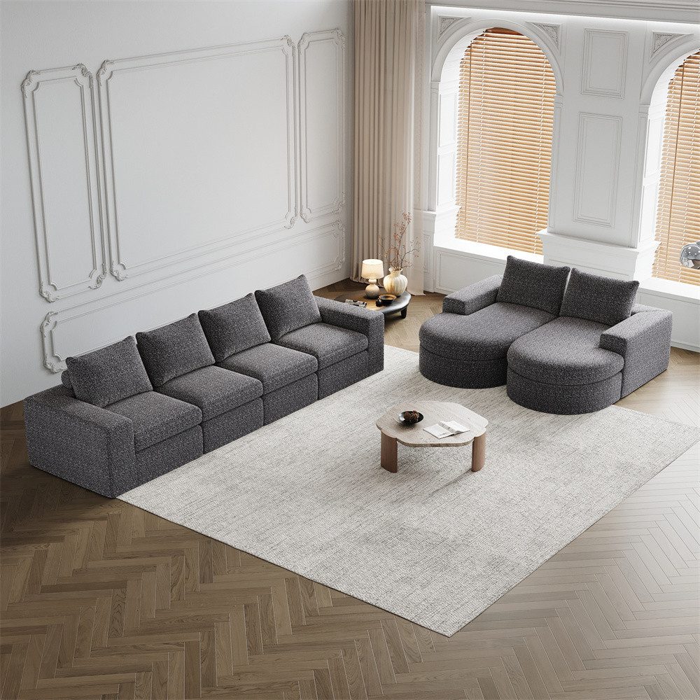 Dieses Chenille-Sofa mit gebogenen Elementen besteht aus vier-acht leicht kombinierbaren Modulen, die eine individuelle Anpassung an Ihren Raum ermöglichen. Die Liegeplätze können sowohl links als auch rechts platziert werden, wodurch das Sofa perfekt auf Fenster- oder Raumaufteilungen abgestimmt werden kann.