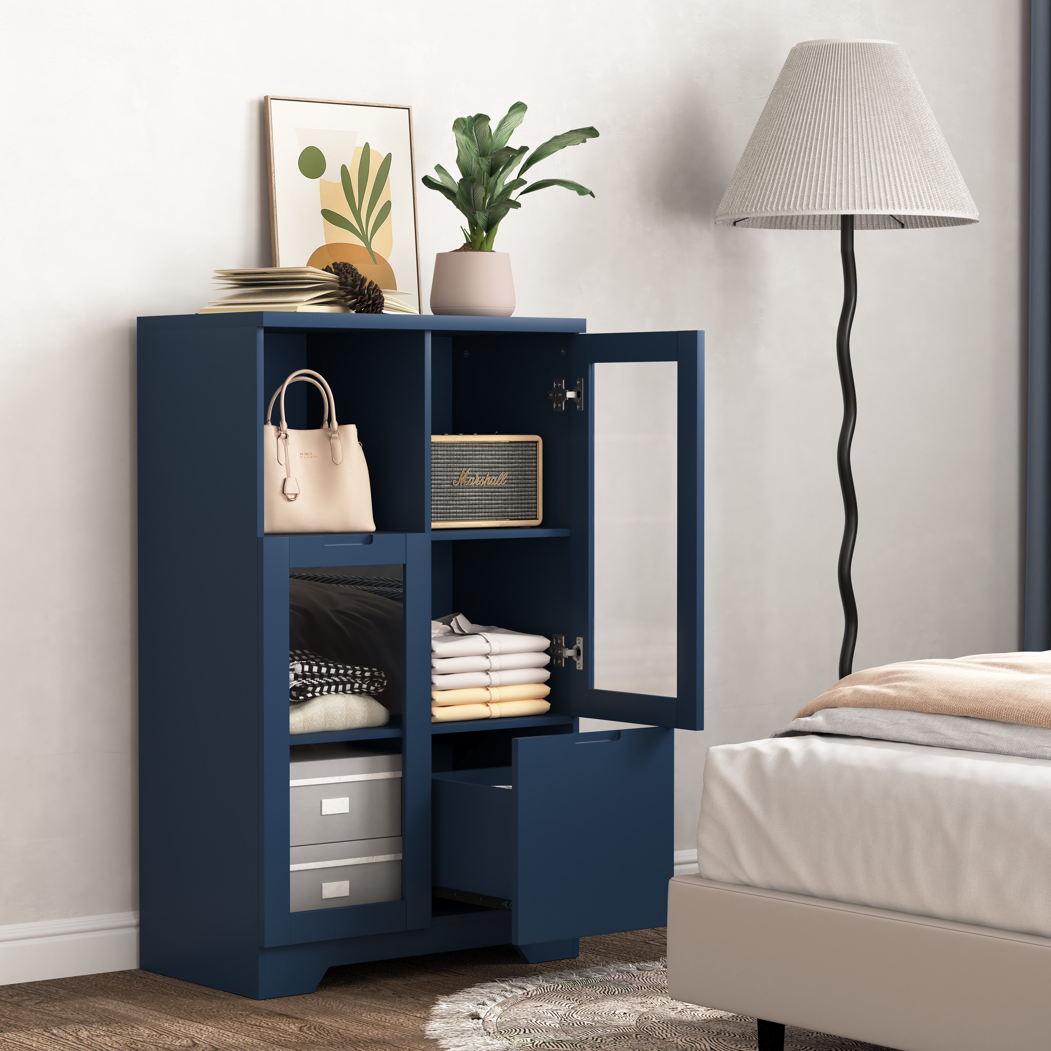 Mit zwei offenen Fächern, einer geräumigen Schublade sowie einem verschlossenen Bereich mit zwei Glastüren und verstellbaren Einlegeböden ist dieser Schrank eine durchdachte Lösung für unterschiedliche Aufbewahrungsbedürfnisse – vom Geschirr über Bücher bis hin zu Bürobedarf. Всеs findet seinen Platz, gut organisiert und sofort griffbereit.