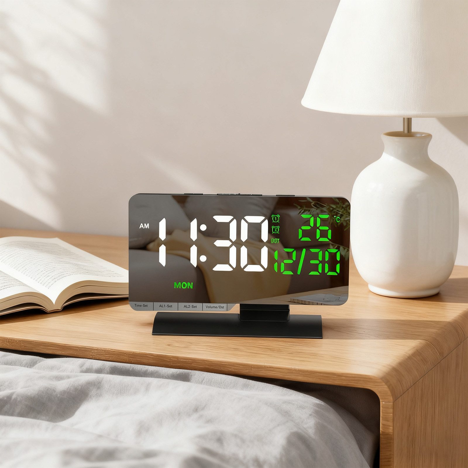 Der REDOM digitale Wecker überzeugt durch sein elegantes Spiegeluhrendesign mit großem 7,3-Zoll-LED-Display. Er vereint zahlreiche Funktionen in einem Gerät: Uhrzeit, Datum, Woche, Temperaturanzeige (°C/°F) und Sekundenanzeige. Die klare LED-Anzeige sorgt für hervorragende Lesbarkeit, während das schwarze Gehäuse jedem Schlafzimmer einen modernen Touch verleiht.