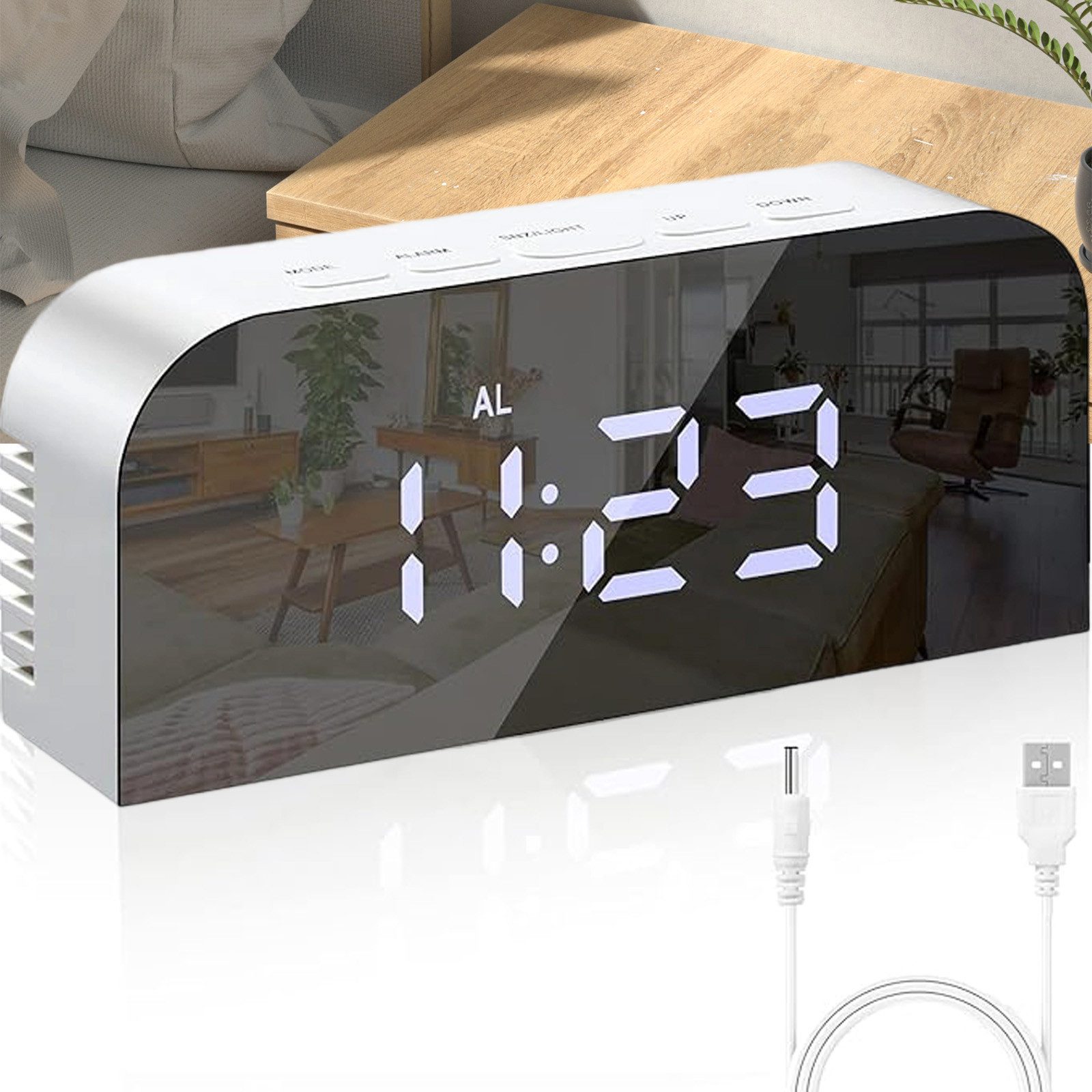 Der REDOM LED Wecker vereint Zeit, Datum und Temperatur (°C/°F) in einem eleganten elektronischen Display. Dank der großen, klaren Ziffern ist die Anzeige sowohl tagsüber als auch nachts problemlos ablesbar. Mit der „Down“-Taste können Sie einfach zwischen Celsius und Fahrenheit wechseln, wodurch die Uhr ideal für jedes Zuhause oder Büro geeignet ist.