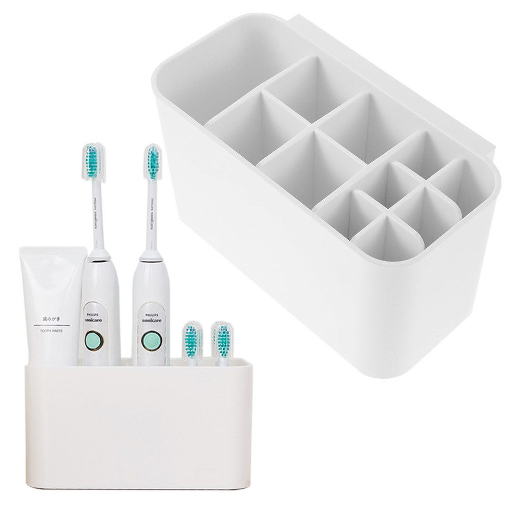 Mit 4 klassischen Zahnbürstenfächern, 6 Steckplätzen für elektrische Zahnbürsten und einem zusätzlichen Aufbewahrungsfach bietet er reichlich Platz für Zahnpasta, Rasierer, Gesichtsreiniger, Kämme und vieles mehr.