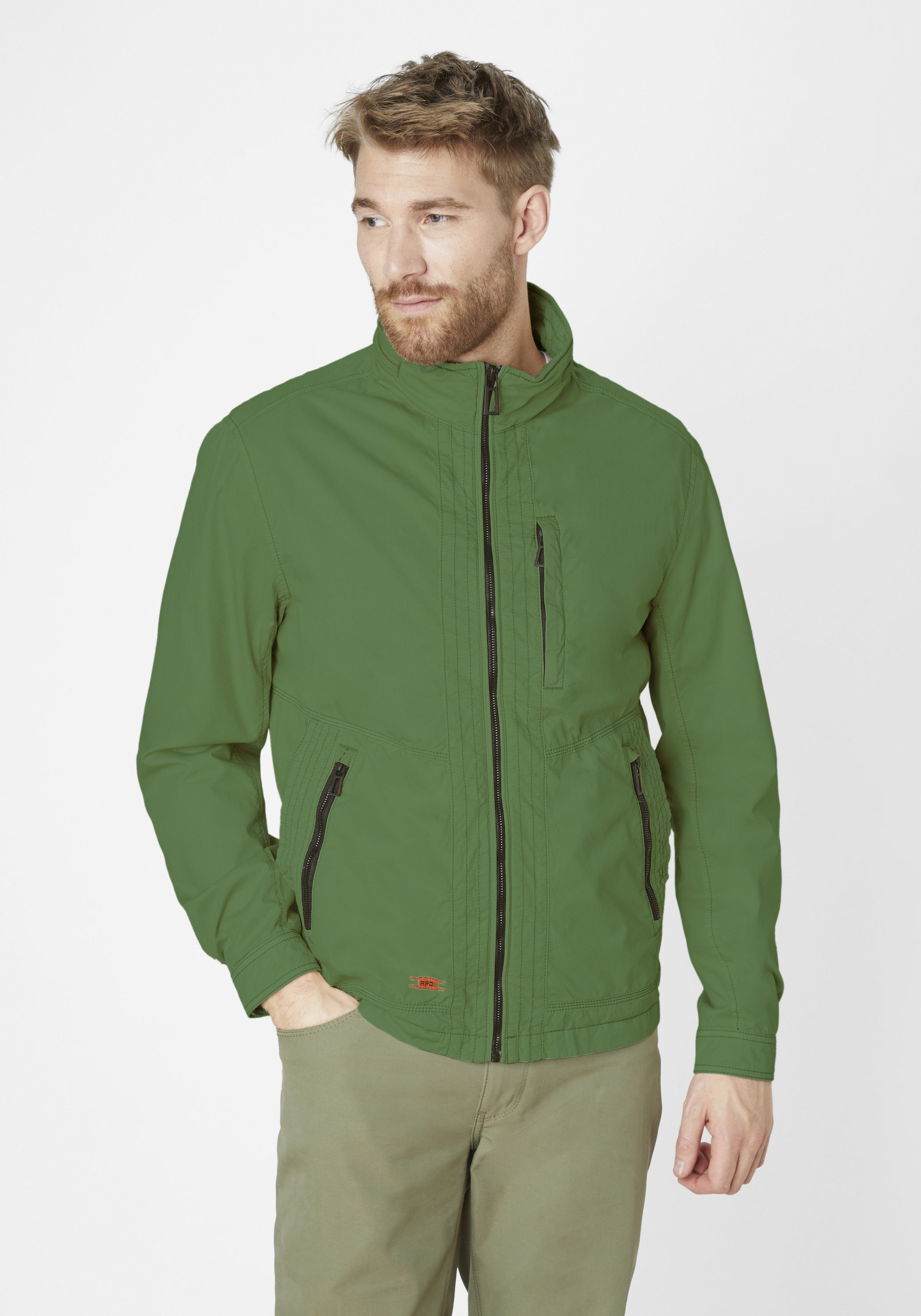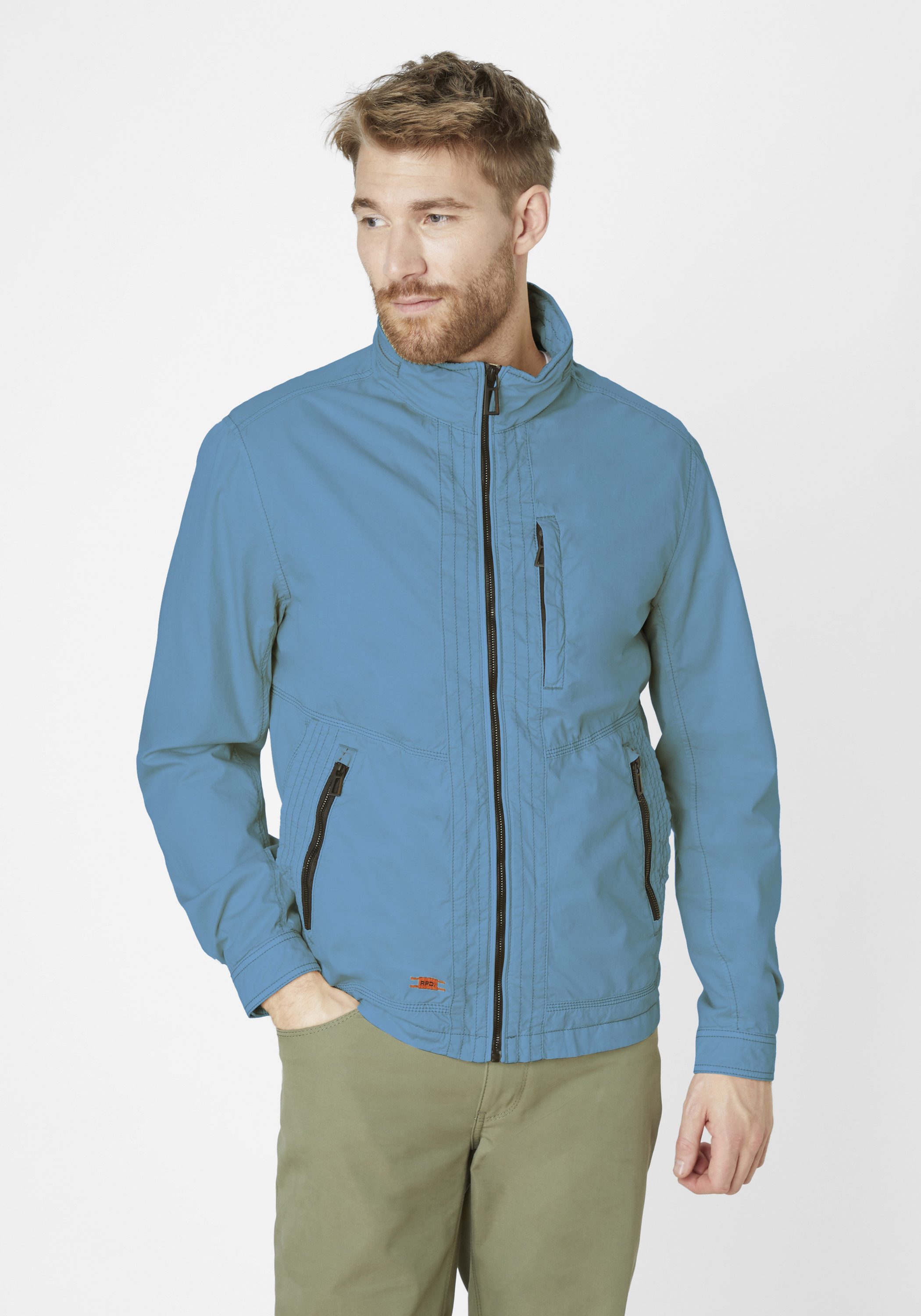 Taschen | Innentasche links mit Reißverschluss, rechts Innentasche mit Klettverschluss. Außentaschen: eine senkrecht gestellte Brusttasche mit Reißverschluss, zwei untere Doppeltaschen eine offen eine mit Reißverschluss. |