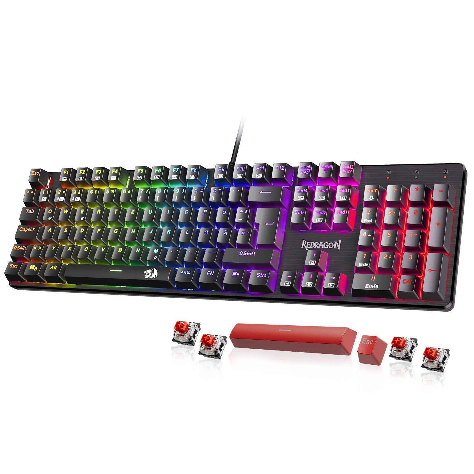 Lieferumfang | 1 x Mechanische Tastatur 1 x Esc-Tastenkappen (rot) 1 x Leertaste (rot) 1 x Benutzerhandbuch |