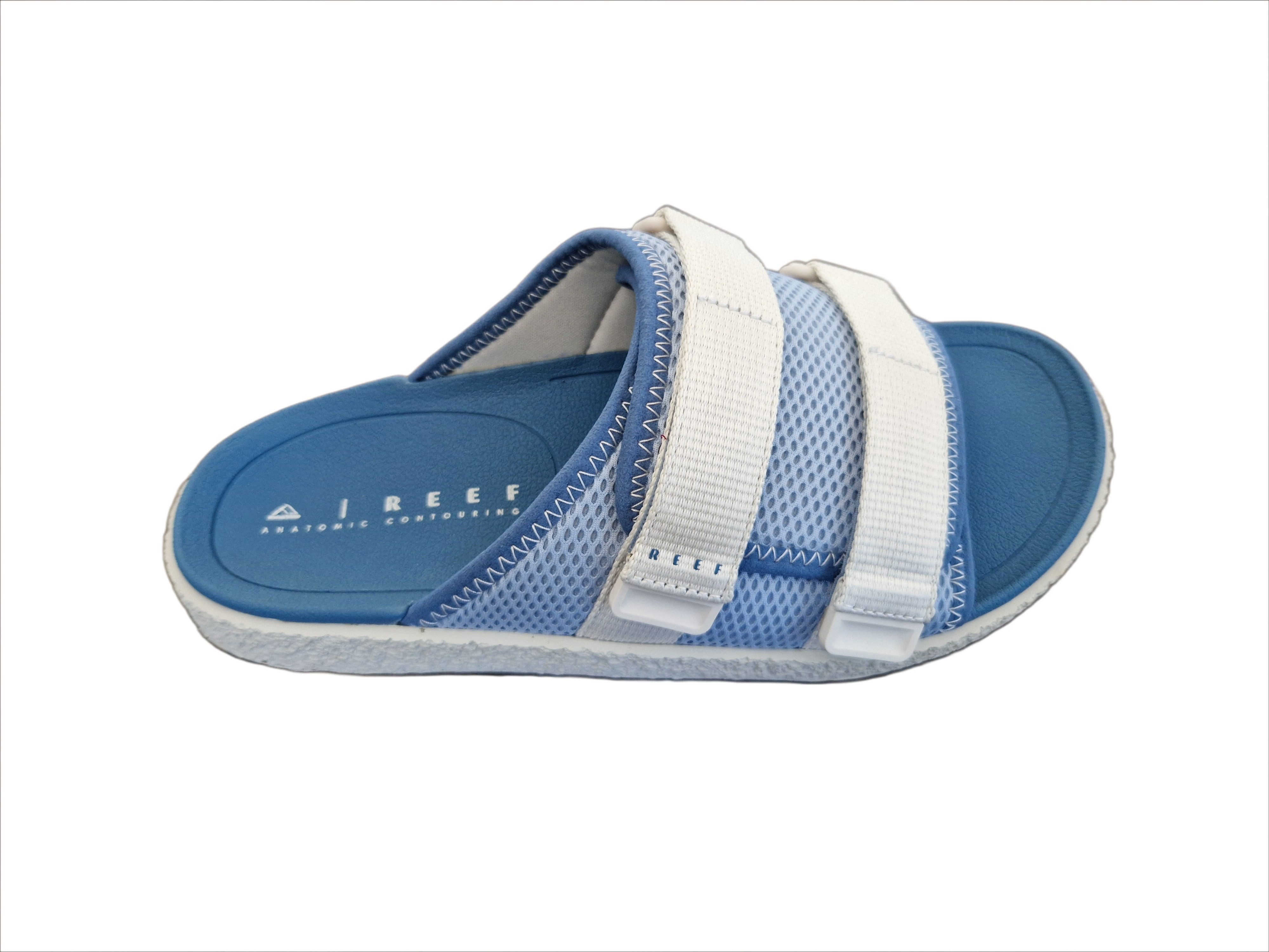 Mit seiner modernen Slide-Silhouette und der kreppigen Gummisohle bringt der Montauk einen markanten Style an den Strand. Mit seinem bequemen Obermaterial aus größtenteils recycelten Materialien und dem weichen, stützenden EVA-Fußbett aus Zuckerrohr bietet diese Slip-On-Sandale höchsten Komfort und Funktionalität. Zwei verstellbare Riemen ermöglichen eine individuelle Passform und bieten nach dem Surfen Platz für Socken. die Schuhe stammen aus der Musterkollektion von Reef - auf der Innenseite steht ein Vermerk "not for resale". der Verkauf wurde von Reef an uns freigegeben