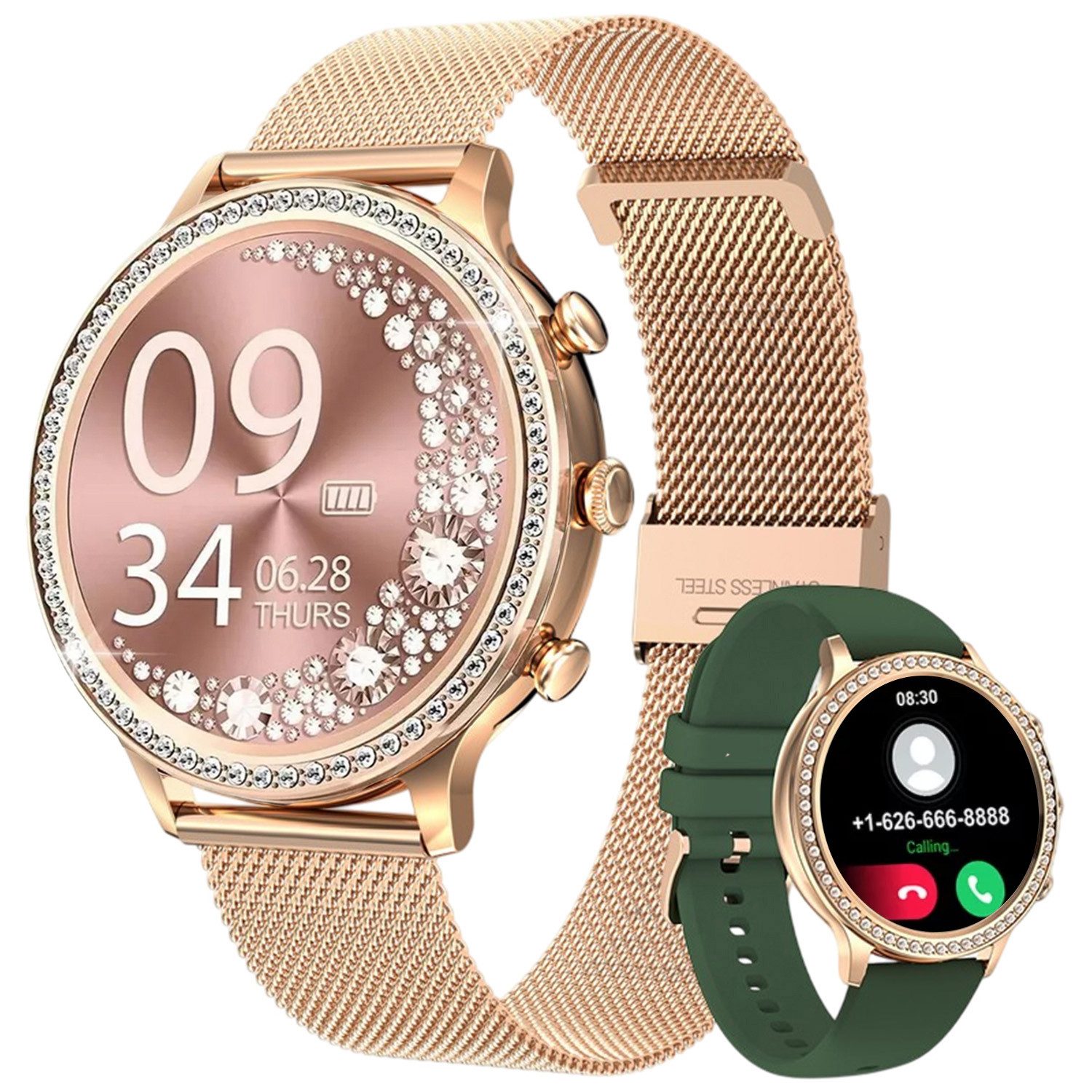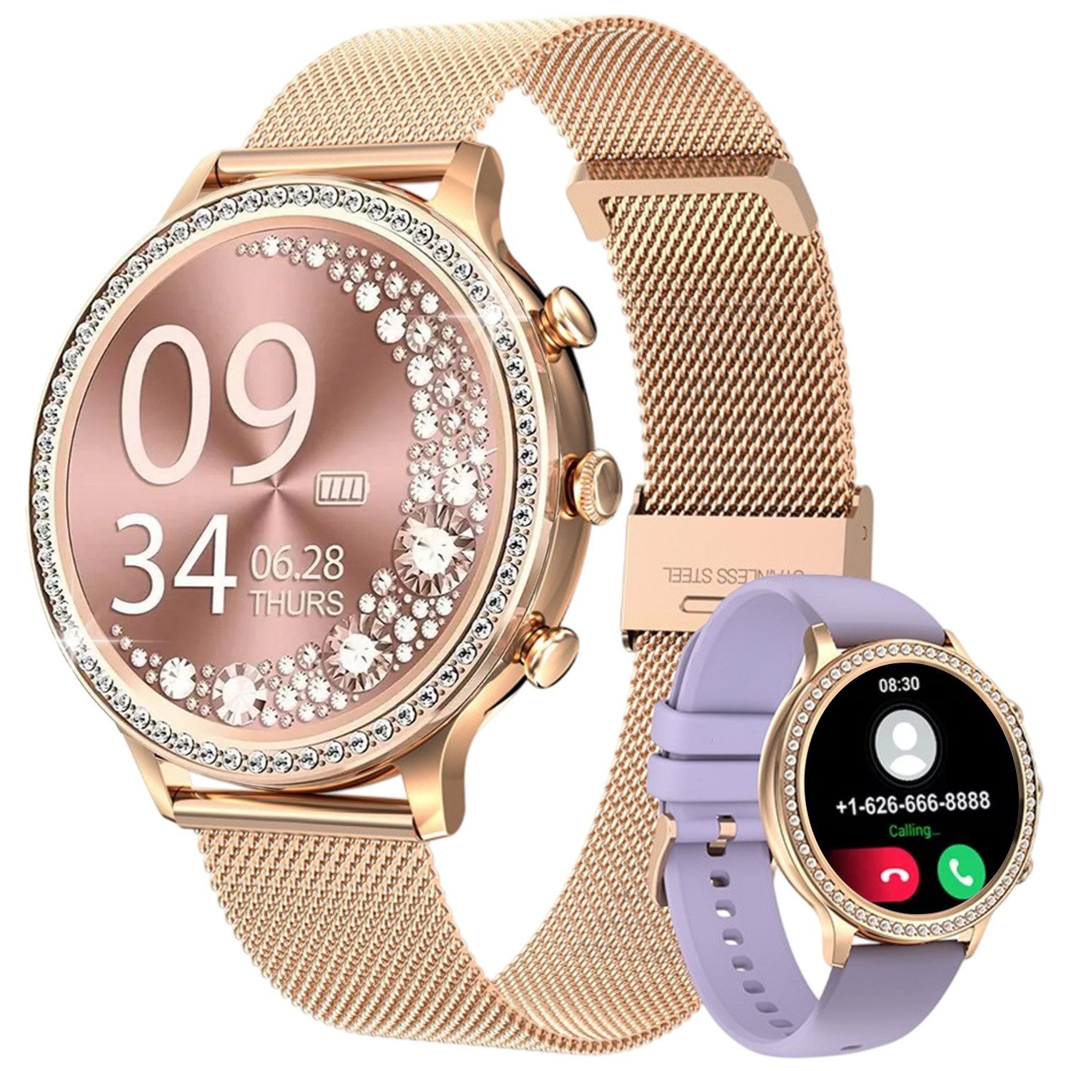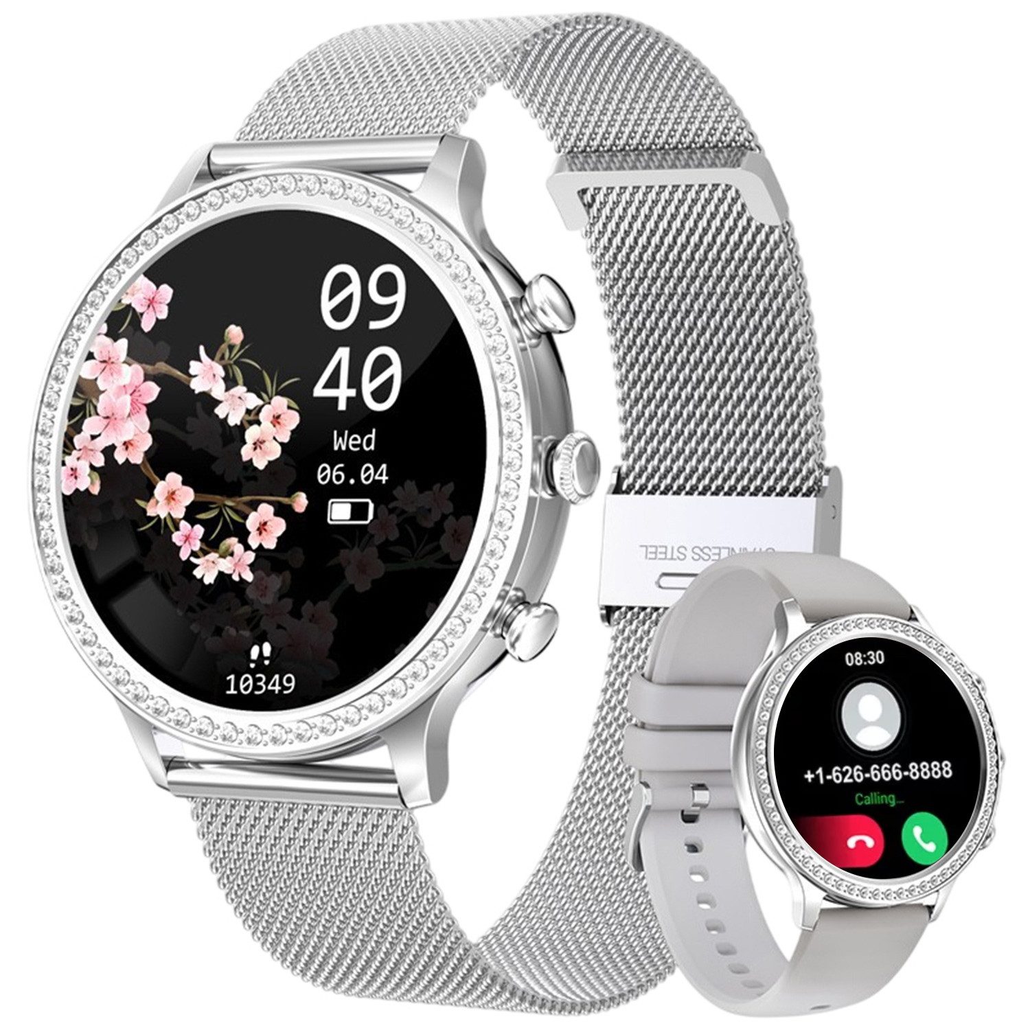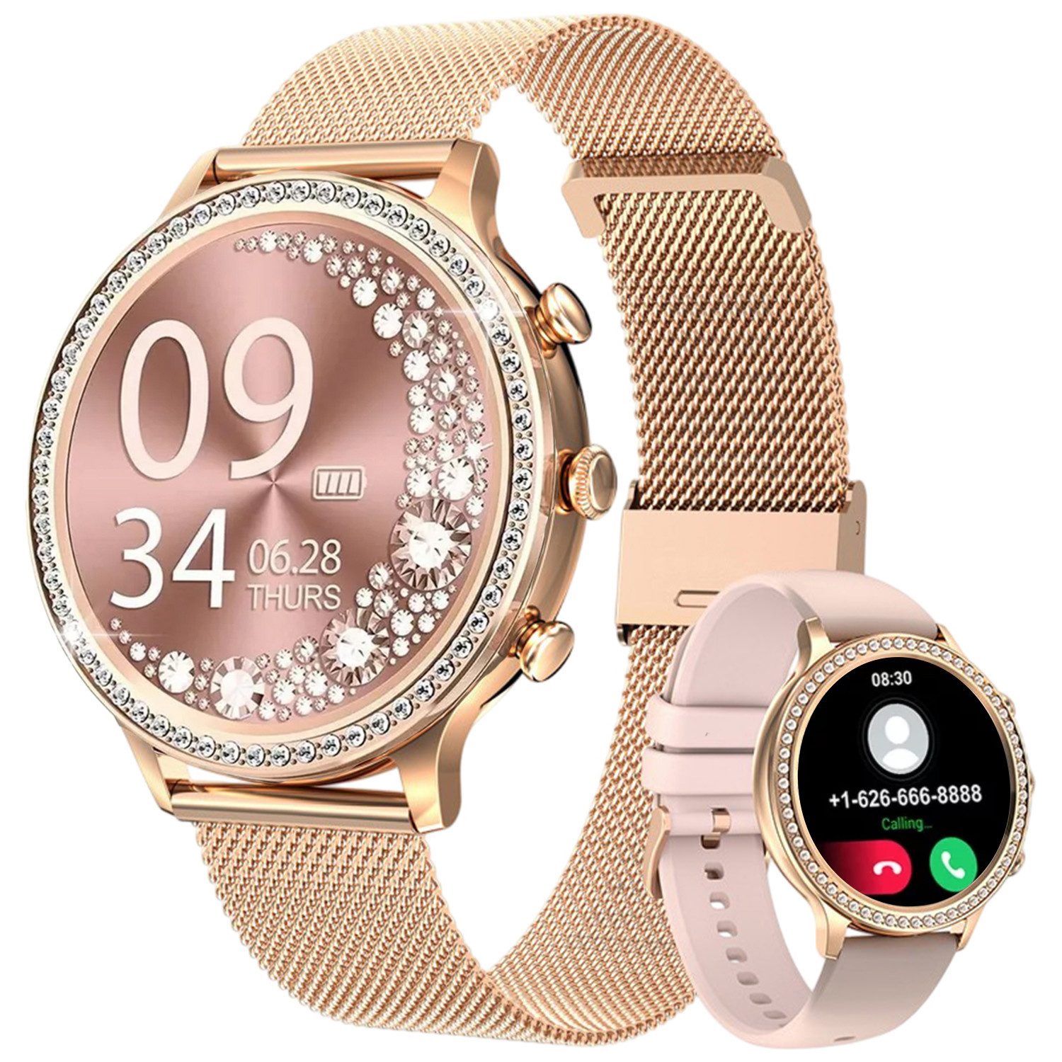 Diese schöne und elegante Damen Smartwatch runde Zifferblattlünette ist mit funkelnden Diamanten besetzt,Die Bluetooth Anruf Smartwatch strahlt ein einzigartiges Licht an Ihrem Handgelenk aus, steigert Ihren Charme und Geschmack und lässt Sie strahlen.