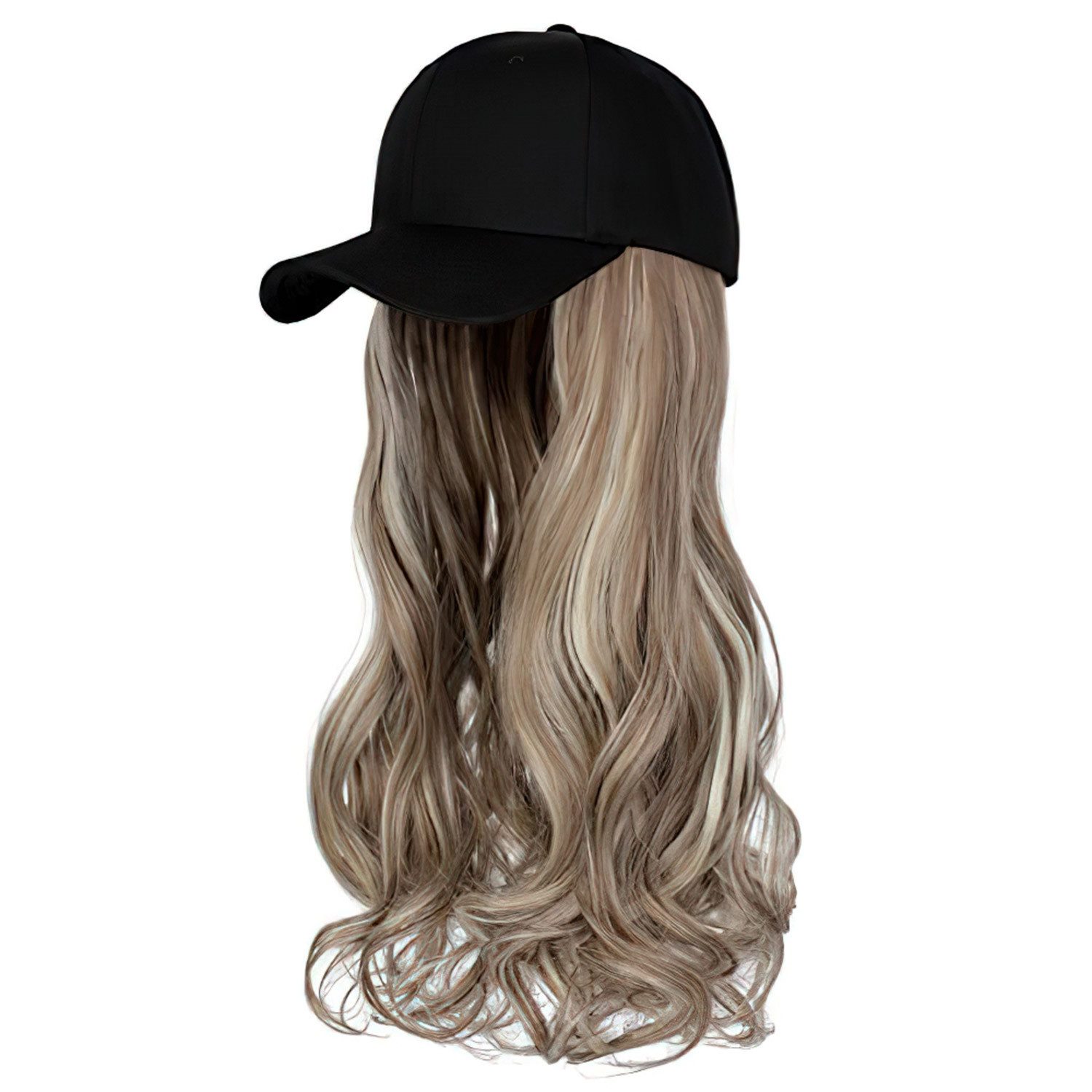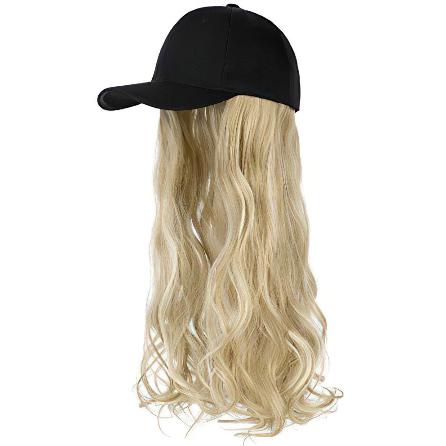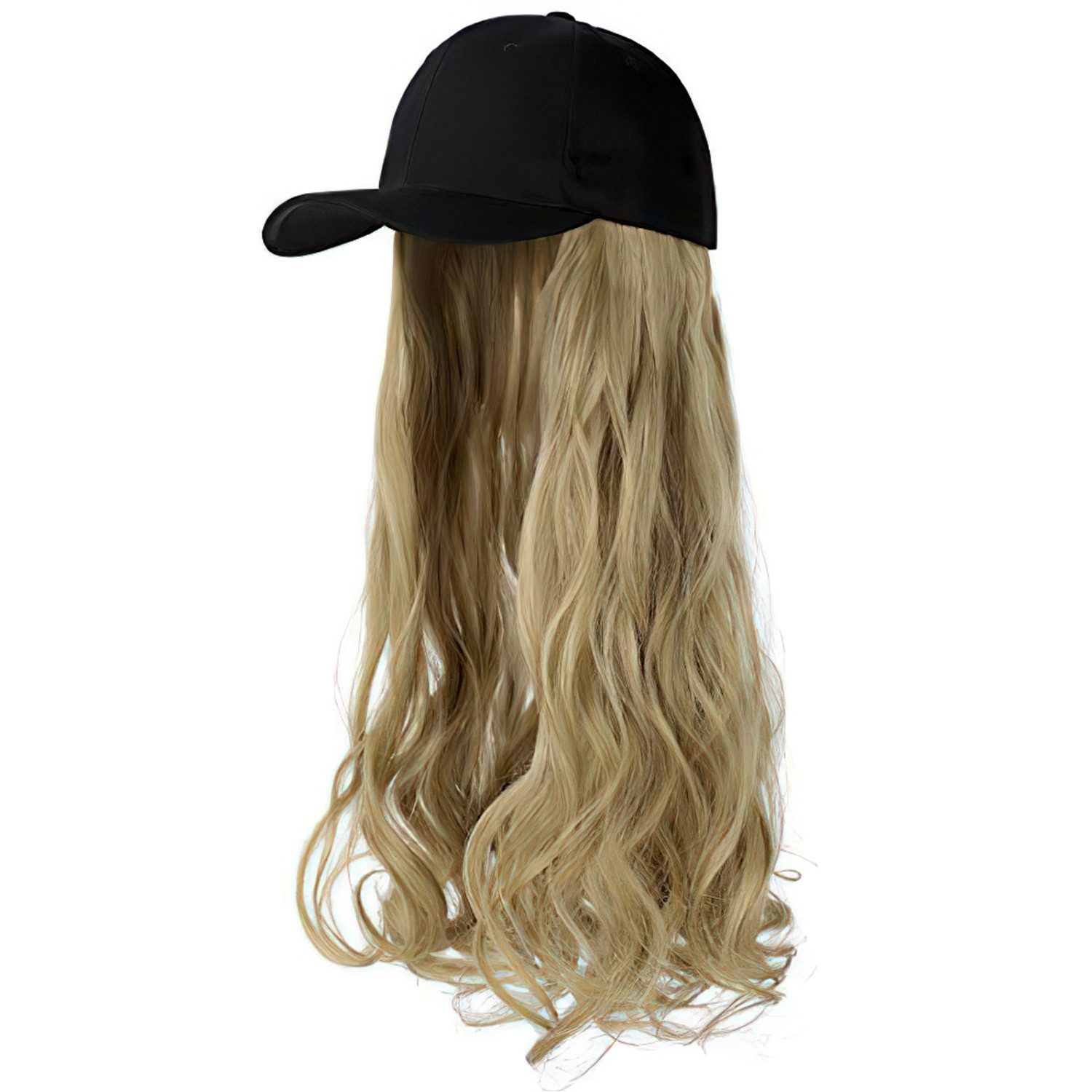 Baseballkappenperücke, Hut mit befestigten Haaren, 66 cm, verstellbare schwarze Kappe mit gewellten, lockigen synthetischen Haarverlängerungen für Frauen und Mädchen