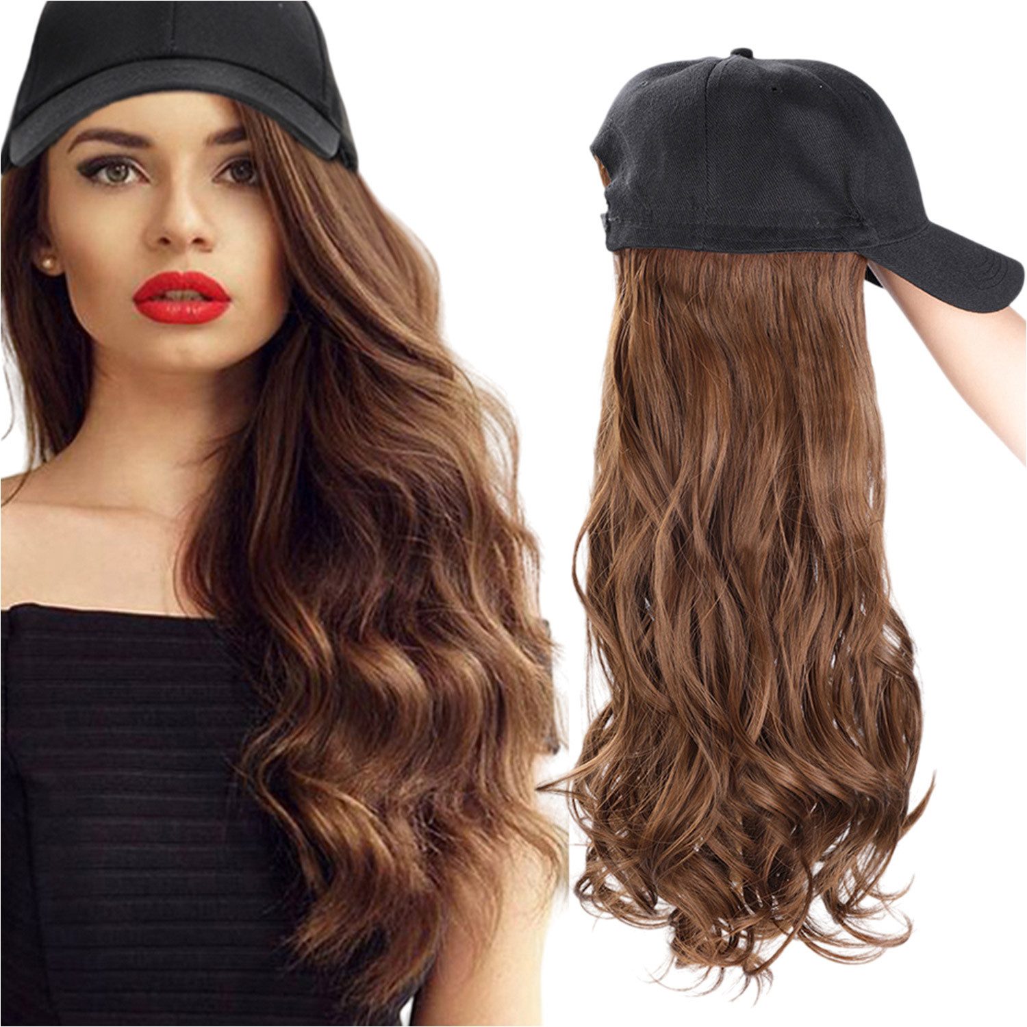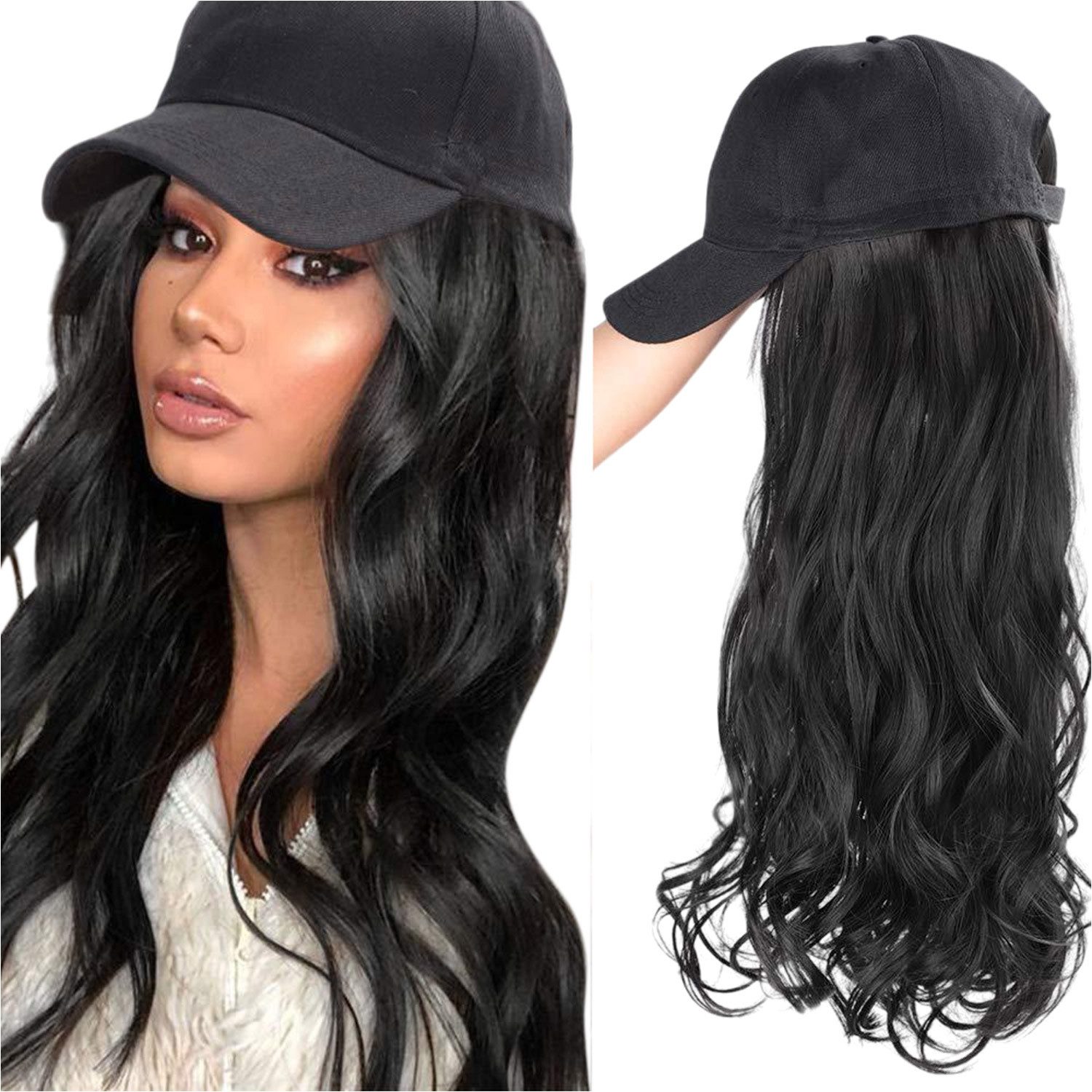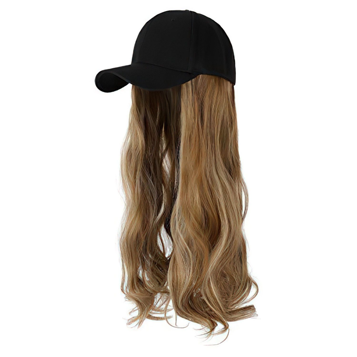 Baseballkappenperücke, Hut mit befestigten Haaren, 66 cm, verstellbare schwarze Kappe mit gewellten, lockigen synthetischen Haarverlängerungen für Frauen und Mädchen