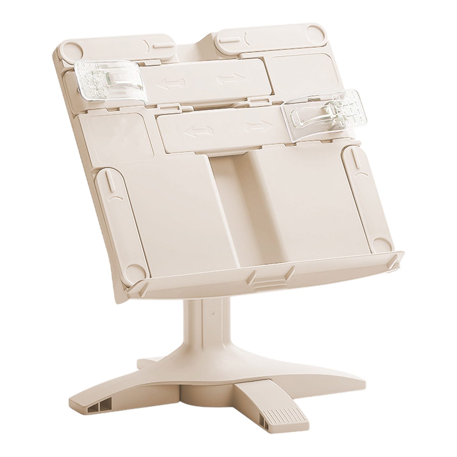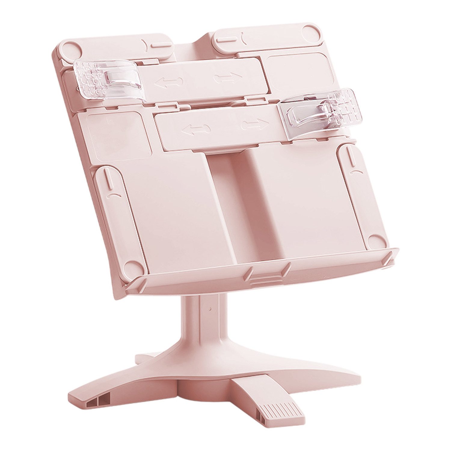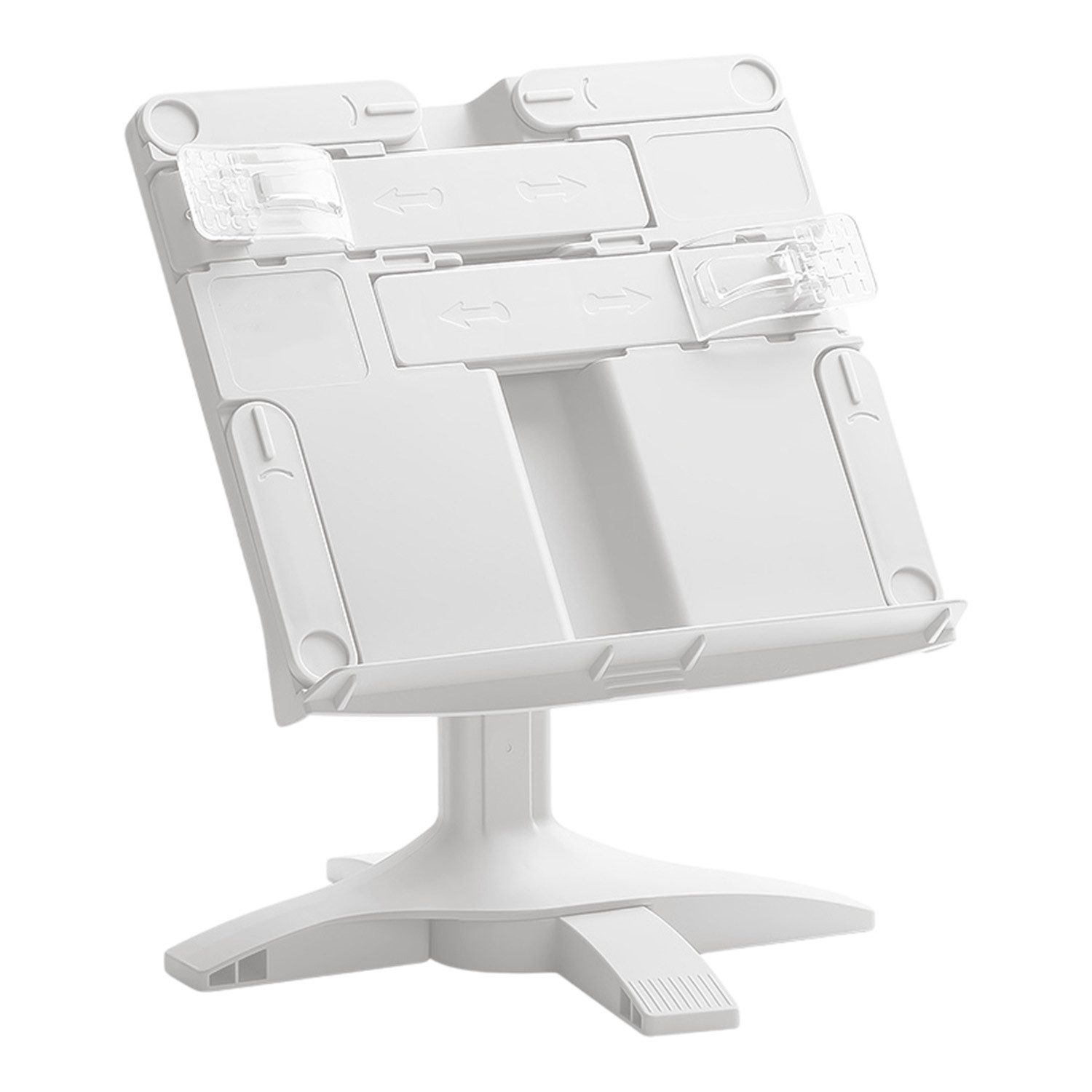 ** Verstellbarer Buchständer: Lehrbuchhalter, ausgestattet mit einer durchsichtigen, schützenden Seiten-Büroklammer. Höhenverstellbar: 22,6–31,6 cm. Winkelverstellbar: 0–160 Grad. Sein ausziehbarer Leseclip und das geriffelte Design sorgen dafür, dass Ihre Bücher perfekt ausgerichtet bleiben. Der Ständer ist mit rutschfesten Pads an der Unterseite ausgestattet und bietet beispiellose Stabilität und Haltbarkeit.