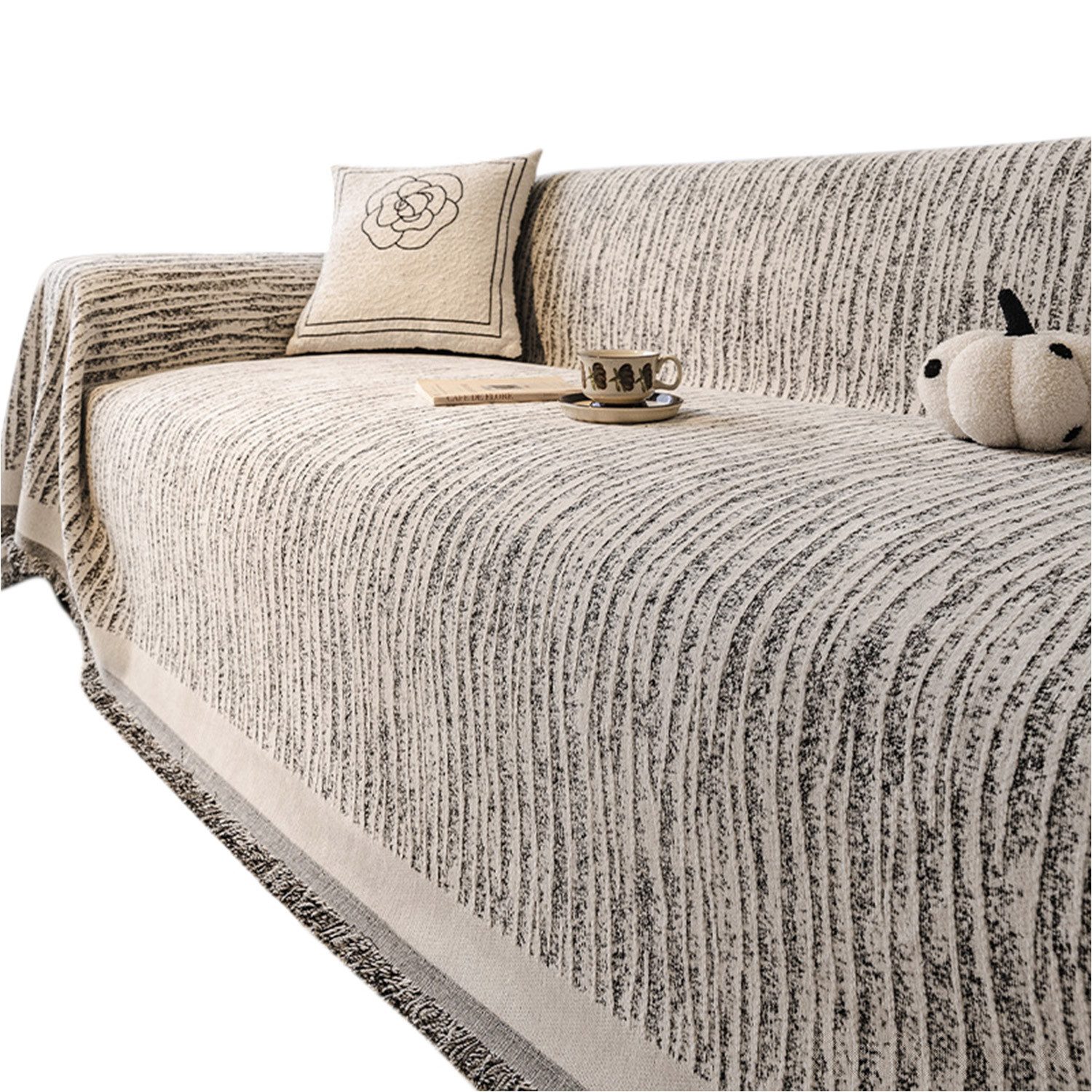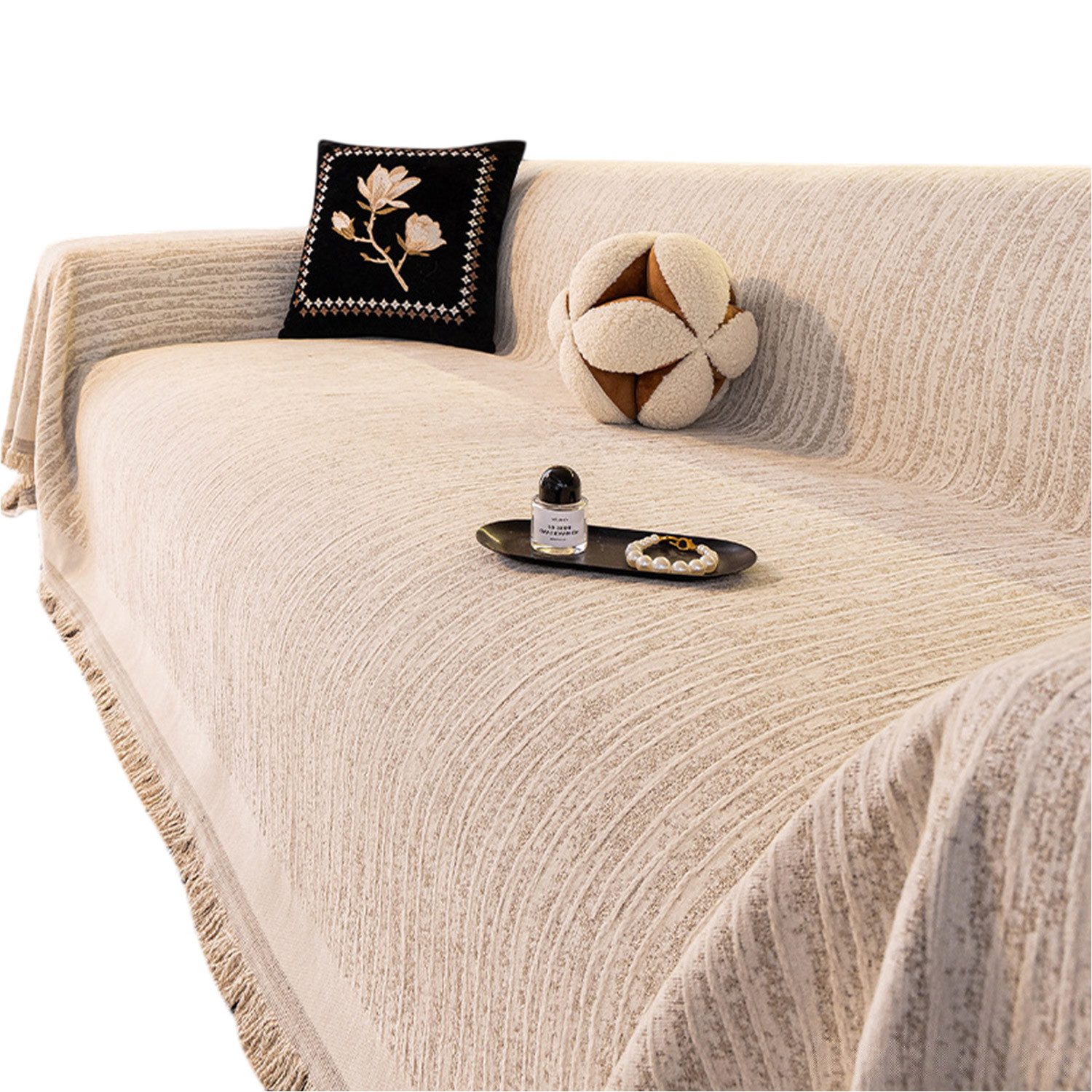 Der Sofabezug ist mit dekorativen Fransen an den Rändern verziert, die einen modernen und stilvollen Akzent setzen. Perfekt für ein trendbewusstes Zuhause, das sowohl chic als auch funktional sein soll.