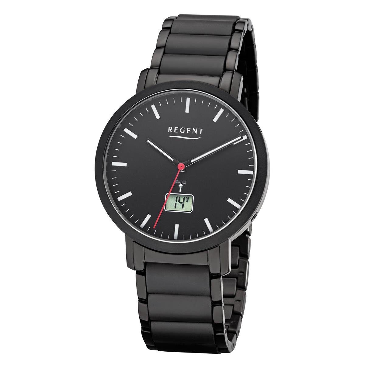 Die schöne Regent Herren Funkuhr überzeugt durch das schlichte Design und die phänomenale Verarbeitung. Diese ist aus Edelstahl und Keramik gefertigt und ist Ionen plattiert beschichtet. Das schwarze Zifferblatt hat schmale Indexe, Zeiger sowie eine digitale Datumsanzeige auf sechs Uhr. Die Herrenuhr hat ein kratzfestes Saphirglas und ist bis zu 5 ATM wasserdicht. Sie können die Funkuhr bedenkenlos zu jedem Outfit tragen.