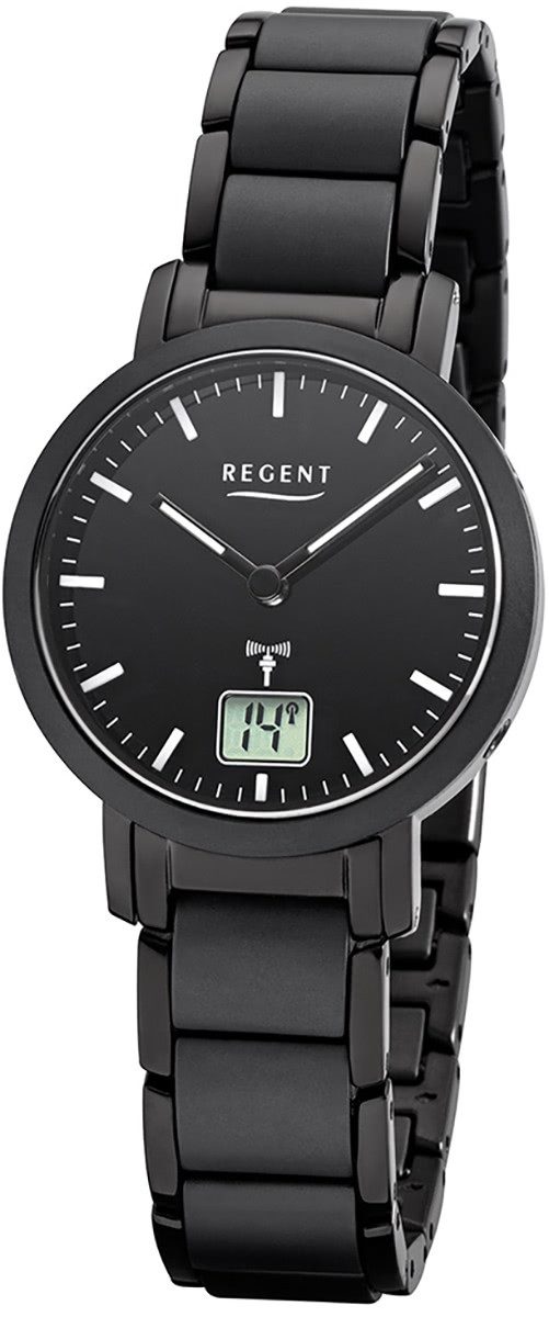 Die Elegant Uhr der Marke Regent hat ein schönes Armband aus Metall in schwarz mit Faltschließe. Eine Uhr aus der Regent Funkuhren Kollektion für Damen in der Gehäusefarbe schwarz mit Funkwerk. Die Analog-Digitaluhr mit Saphirglas hat ein Zifferblatt in der Farbe schwarz. Die Form der Uhr ist rund und das Gehäuse ist klein ca. 30mm.