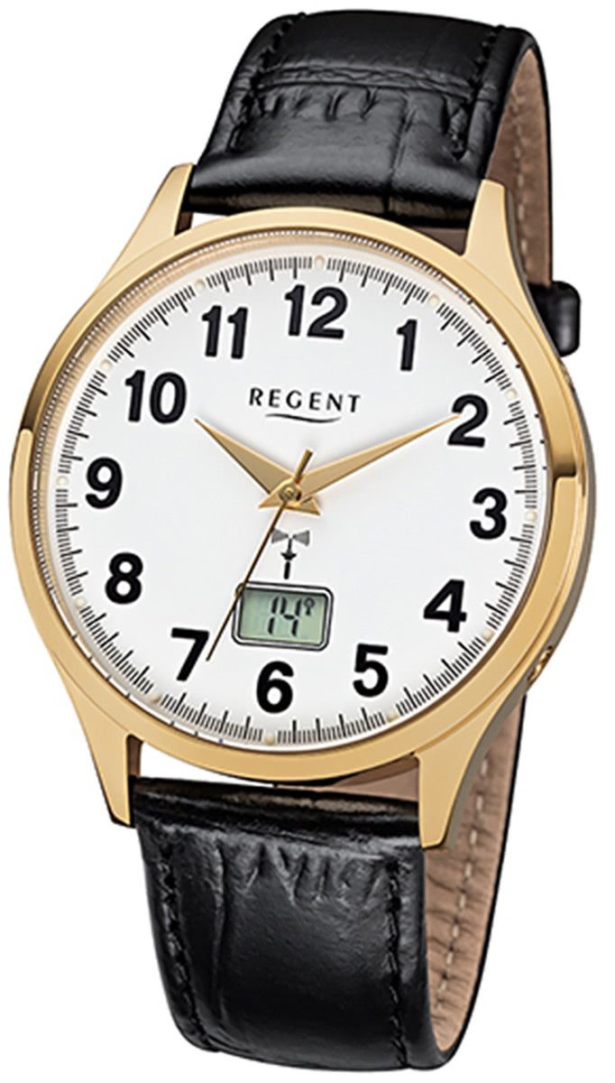 Die Elegant Uhr der Marke Regent hat ein schönes Armband aus Leder in schwarz mit Dornschließe. Eine Uhr aus der Regent Funkuhren Kollektion für Herren in der Gehäusefarbe gold mit Funkuhr. Die Analoguhr mit Mineralglas hat ein Zifferblatt in der Farbe weiß. Die Form der Uhr ist rund und das Gehäuse ist groß ca. 40mm.