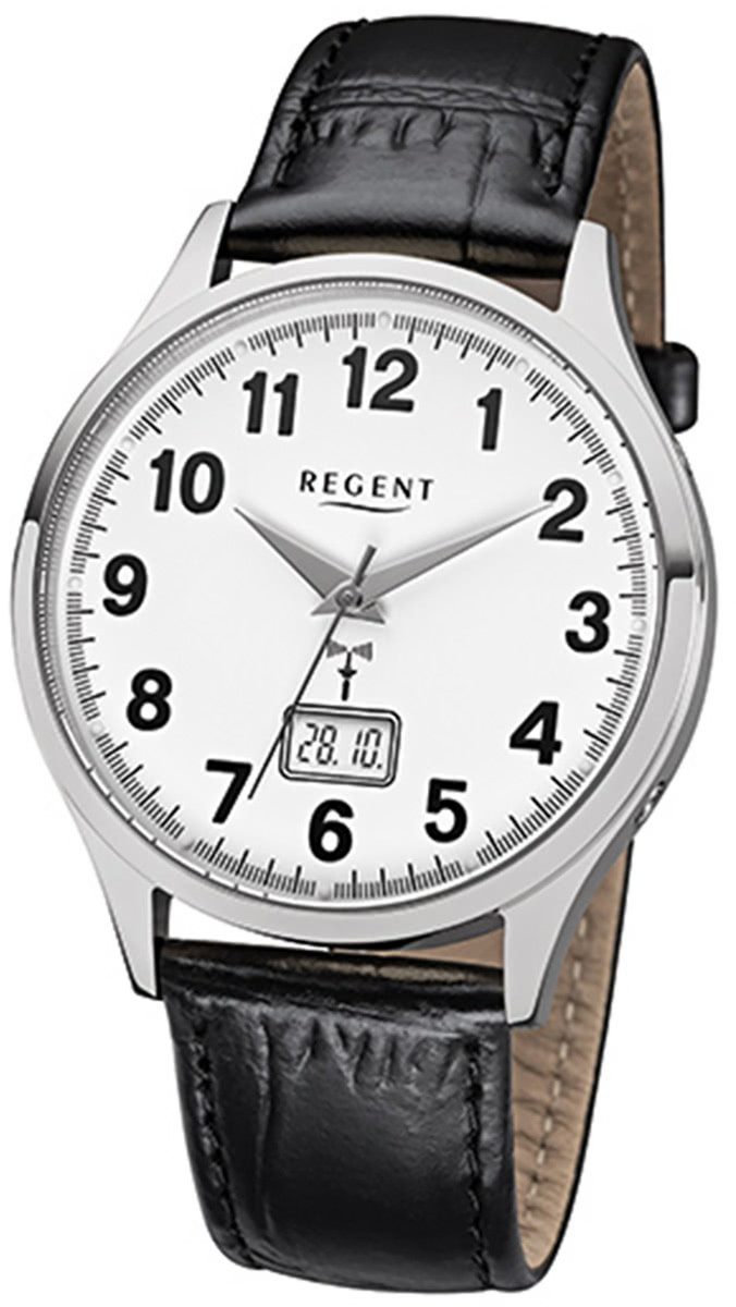 Die Elegant Uhr der Marke Regent hat ein schönes Armband aus Leder in schwarz mit Dornschließe. Eine Uhr aus der Regent Funkuhren Kollektion für Herren in der Gehäusefarbe silber mit Funkuhr. Die Analog-Digitaluhr mit Mineralglas hat ein Zifferblatt in der Farbe weiß. Die Form der Uhr ist rund und das Gehäuse ist groß ca. 40mm.