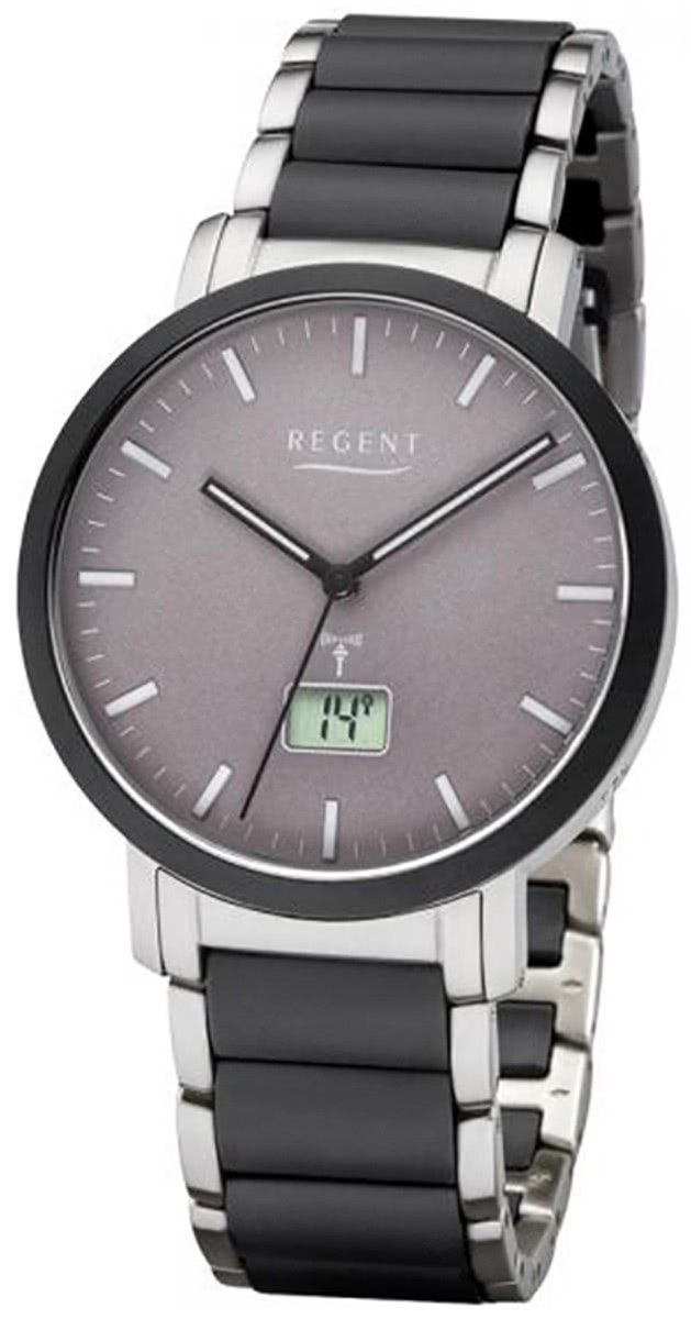 Die Elegant Uhr der Marke Regent hat ein schönes Armband aus Metall in schwarz silber mit Faltschließe. Eine Uhr aus der Regent Funkuhren Kollektion für Herren in der Gehäusefarbe mehrfarbig mit Funkwerk. Die Analog-Digitaluhr mit Saphirglas hat ein Zifferblatt in der Farbe grau. Die Form der Uhr ist rund und das Gehäuse ist groß ca. 40mm.