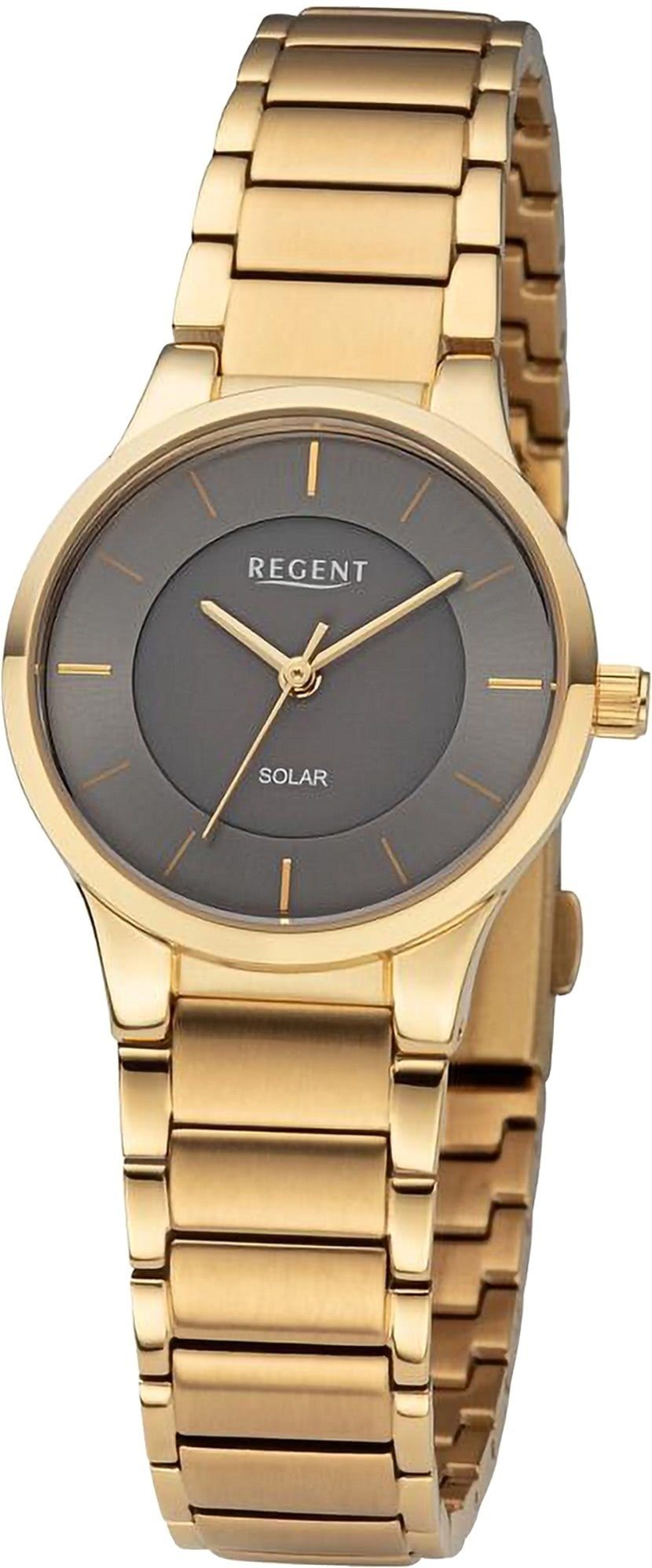 Die Casual Uhr der Marke Regent hat ein schönes Armband aus Metall in gold mit Faltschließe. Eine Uhr aus der Regent Metallarmband Kollektion für Damen in der Gehäusefarbe gold mit Quarzwerk. Die Analoguhr mit Mineralglas hat ein Zifferblatt in der Farbe dunkelgrau. Die Form der Uhr ist rund und das Gehäuse ist klein ca. 28mm im Durchmesser.