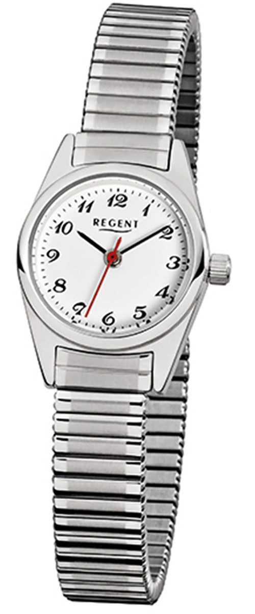 Die Elegant Uhr der Marke Regent hat ein schönes Armband aus Edelstahl in silber mit Zugband. Eine Uhr aus der Regent Zugarmband Kollektion für Damen in der Gehäusefarbe silber mit Quarzwerk. Die Analoguhr mit Mineralglas hat ein Zifferblatt in der Farbe weiß. Die Form der Uhr ist rund und das Gehäuse ist klein ca. 22mm.