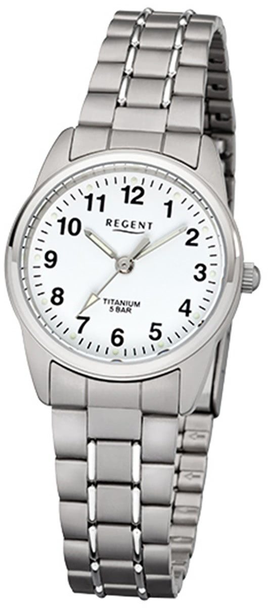 Die Elegant Uhr der Marke Regent hat ein schönes Armband aus Titan in silber grau mit Faltschließe. Eine Uhr aus der Regent Titan-Uhren Kollektion für Damen in der Gehäusefarbe silber grau mit Quarzwerk. Die Analoguhr mit Mineralglas hat ein Zifferblatt in der Farbe weiß. Die Form der Uhr ist rund und das Gehäuse ist klein ca. 26mm.