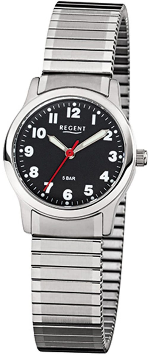 Die Elegant Uhr der Marke Regent hat ein schönes Armband aus Edelstahl in silber mit Zugband. Eine Uhr aus der Regent Zugarmband Kollektion für Damen Herren in der Gehäusefarbe silber mit Quarzwerk. Die Analoguhr mit Mineralglas hat ein Zifferblatt in der Farbe schwarz. Die Form der Uhr ist rund und das Gehäuse ist klein ca. 28mm.