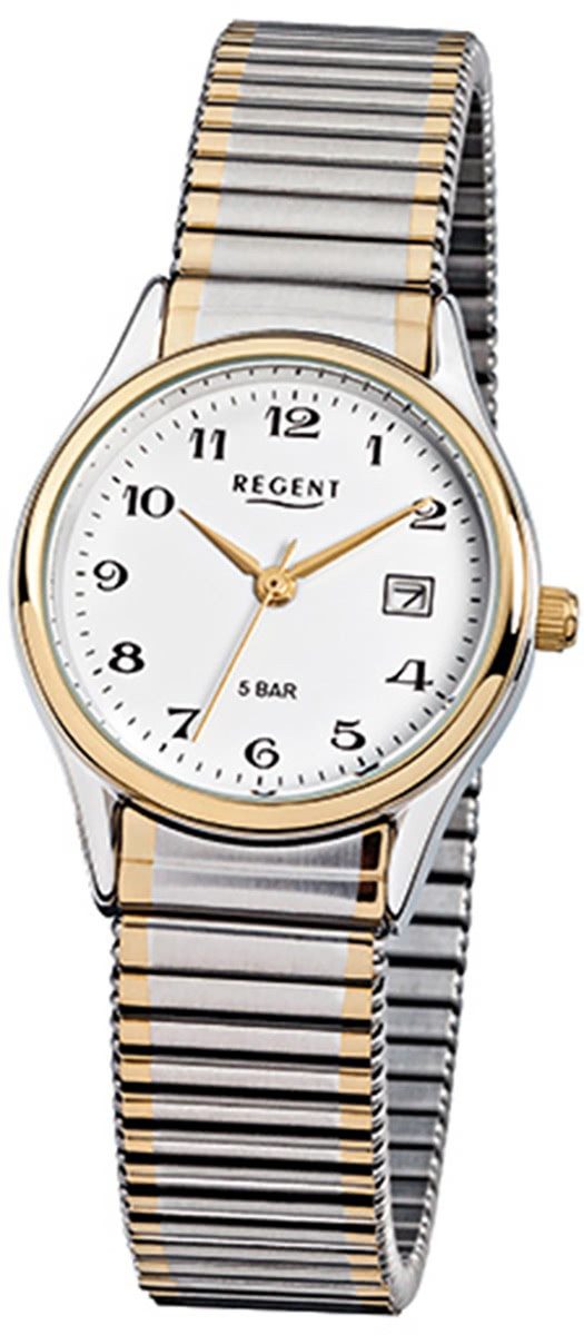 Die Elegant Uhr der Marke Regent hat ein schönes Armband aus Edelstahl ionenplattiert gold in silber gold mit Zugband. Eine Uhr aus der Regent Zugarmband Kollektion für Damen Herren in der Gehäusefarbe silber gold mit Quarzwerk. Die Analoguhr mit Mineralglas hat ein Zifferblatt in der Farbe weiß. Die Form der Uhr ist rund und das Gehäuse ist klein ca. 29mm.