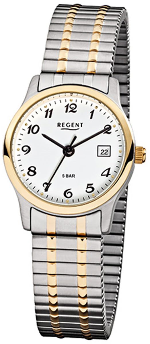 Die Elegant Uhr der Marke Regent hat ein schönes Armband aus Edelstahl ionenplattiert gold in silber gold mit Zugband. Eine Uhr aus der Regent Zugarmband Kollektion für Damen Herren in der Gehäusefarbe silber gold mit Quarzwerk. Die Analoguhr mit Mineralglas hat ein Zifferblatt in der Farbe weiß. Die Form der Uhr ist rund und das Gehäuse ist klein ca. 27mm.