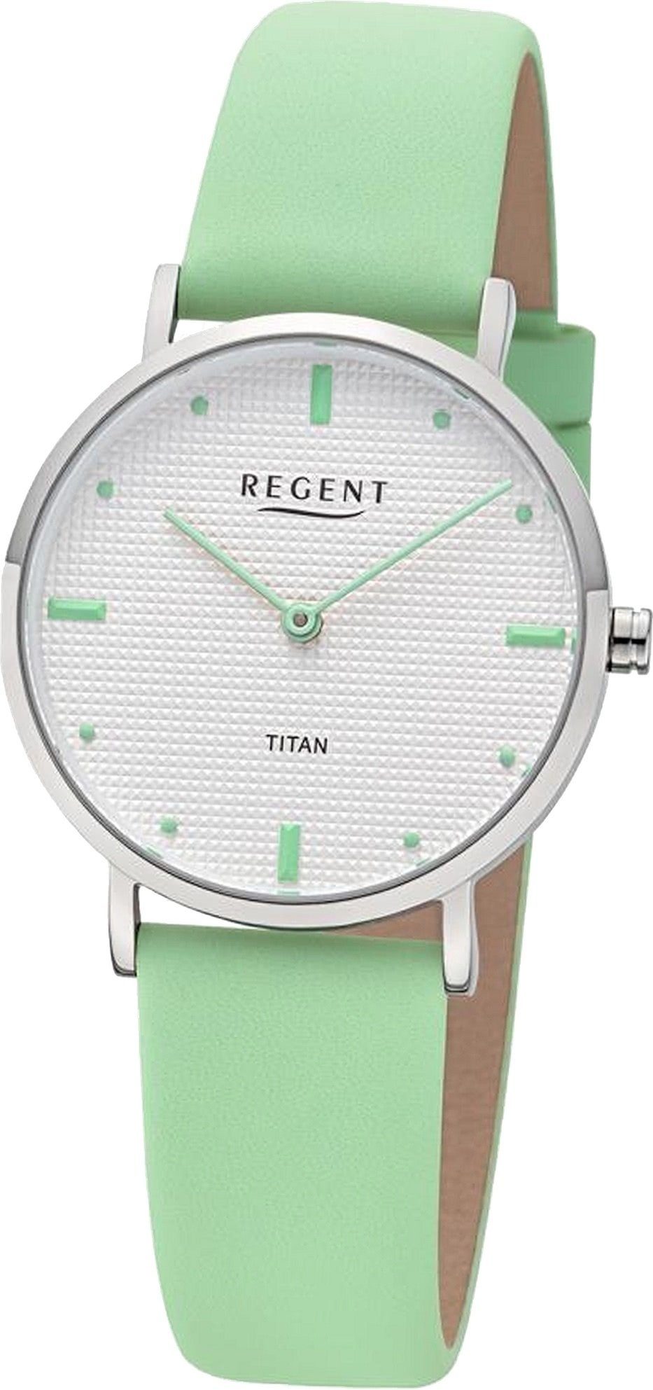 Die Elegant Uhr der Marke Regent hat ein schönes Armband aus Leder in hellgrün mit Dornschließe. Eine Uhr aus der Regent Titan-Uhren Kollektion für Damen in der Gehäusefarbe silber mit Quarzwerk. Die Analoguhr mit Mineralglas hat ein Zifferblatt in der Farbe silber. Die Form der Uhr ist rund und das Gehäuse ist mittel ca. 32mm im Durchmesser.