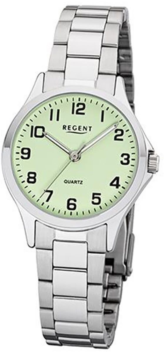 Die Elegant Uhr der Marke Regent hat ein schönes Armband aus Metall in silber mit Faltschließe. Eine Uhr aus der Regent Metallarmband Kollektion für Damen in der Gehäusefarbe silber mit Quarzwerk. Die Analoguhr mit Mineralglas hat ein Zifferblatt in der Farbe leuchtend. Die Form der Uhr ist rund und das Gehäuse ist klein ca. 29mm.