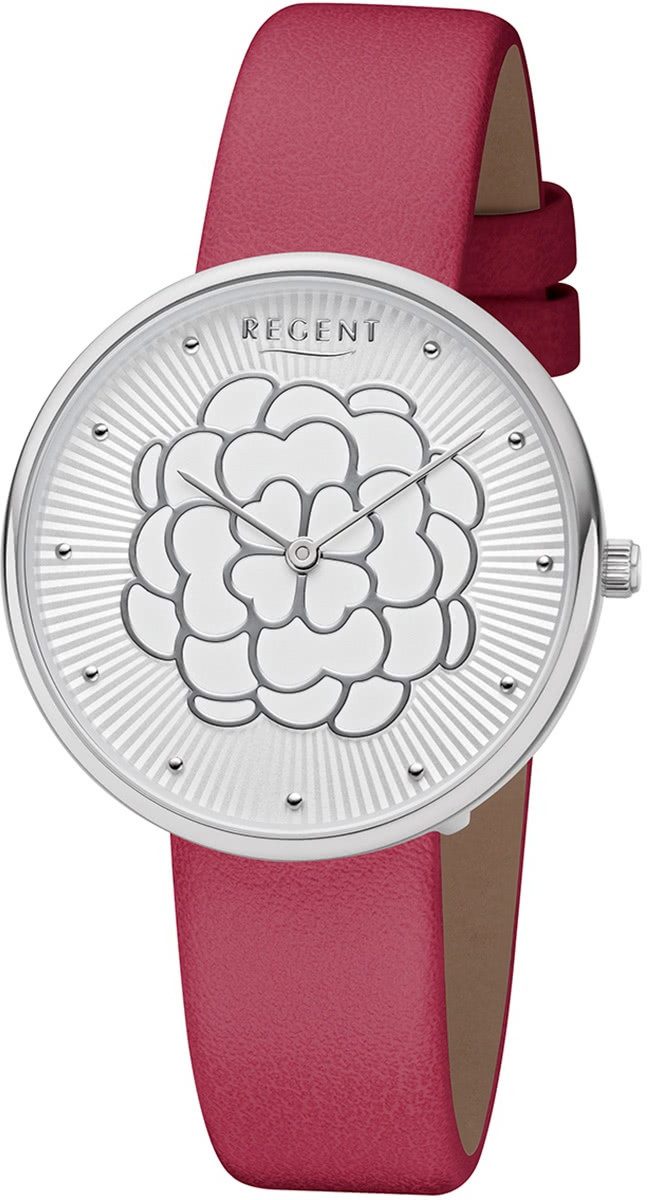 Die Fashion Uhr der Marke Regent hat ein schönes Armband aus Leder in rot mit Dornschließe. Eine Uhr aus der Regent Blütezeit Kollektion für Damen in der Gehäusefarbe silber mit Quarzwerk. Die Analoguhr mit Mineralglas hat ein Zifferblatt in der Farbe weiß grau. Die Form der Uhr ist rund und das Gehäuse ist mittel ca. 36mm im Durchmesser.
