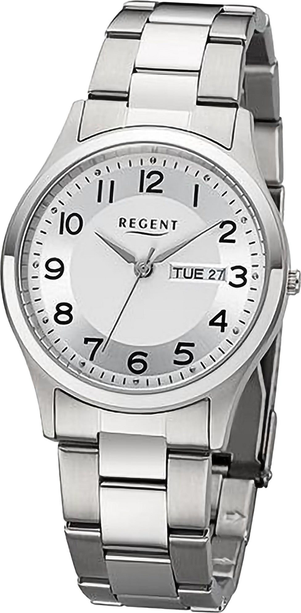 Die Casual Uhr der Marke Regent hat ein schönes Armband aus Metall in silber mit Faltschließe. Eine Uhr aus der Regent Metallarmband Kollektion für Herren in der Gehäusefarbe silber mit Quarzwerk. Die Analoguhr mit Mineralglas hat ein Zifferblatt in der Farbe silber. Die Form der Uhr ist rund und das Gehäuse ist mittel ca. 37mm im Durchmesser.