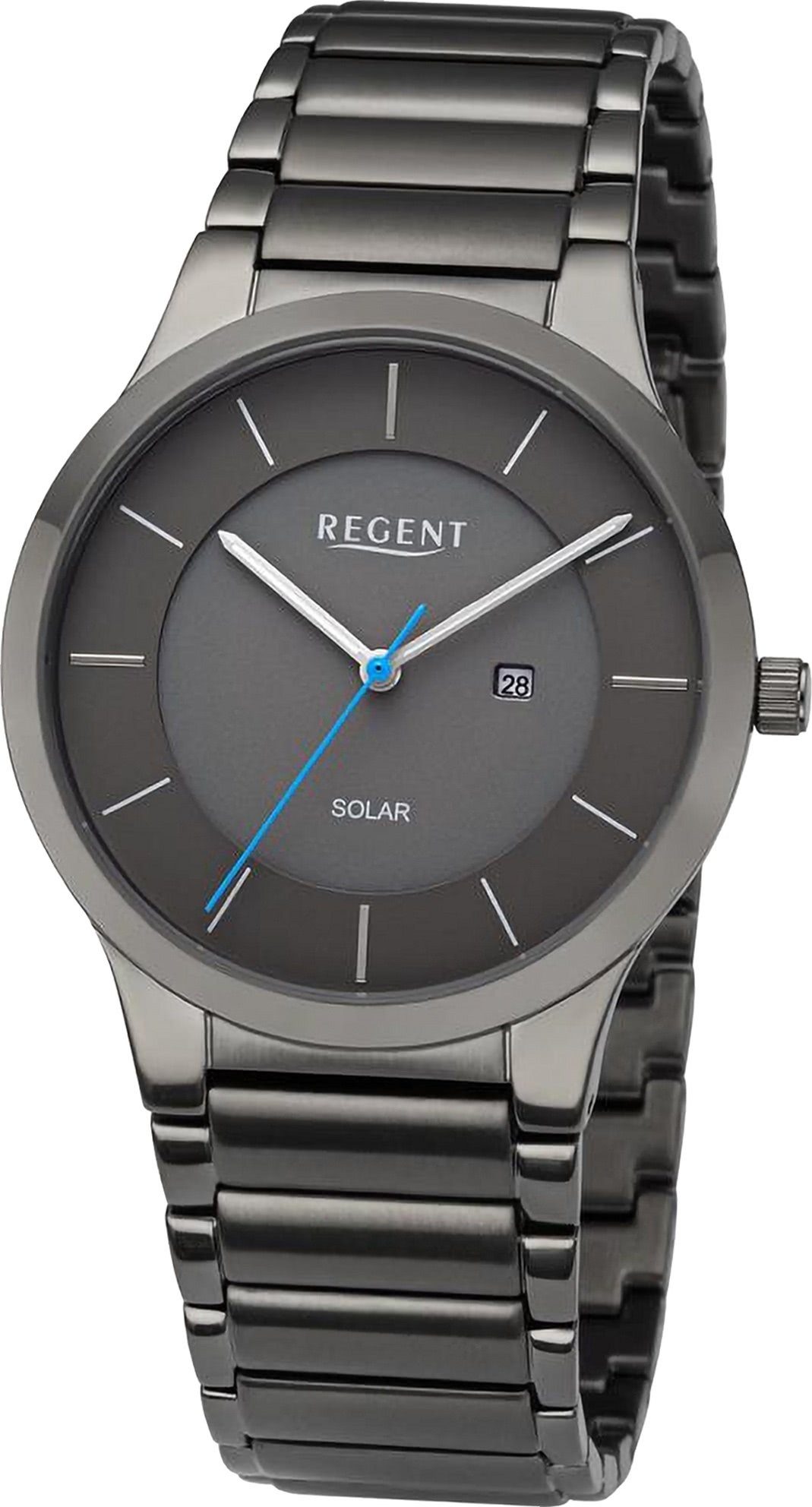 Die Casual Uhr der Marke Regent hat ein schönes Armband aus Metall in dunkelgrau mit Faltschließe. Eine Uhr aus der Regent Metallarmband Kollektion für Herren in der Gehäusefarbe dunkelgrau mit Quarzwerk. Die Analoguhr mit Mineralglas hat ein Zifferblatt in der Farbe dunkelgrau. Die Form der Uhr ist rund und das Gehäuse ist mittel ca. 38,5mm im Durchmesser.