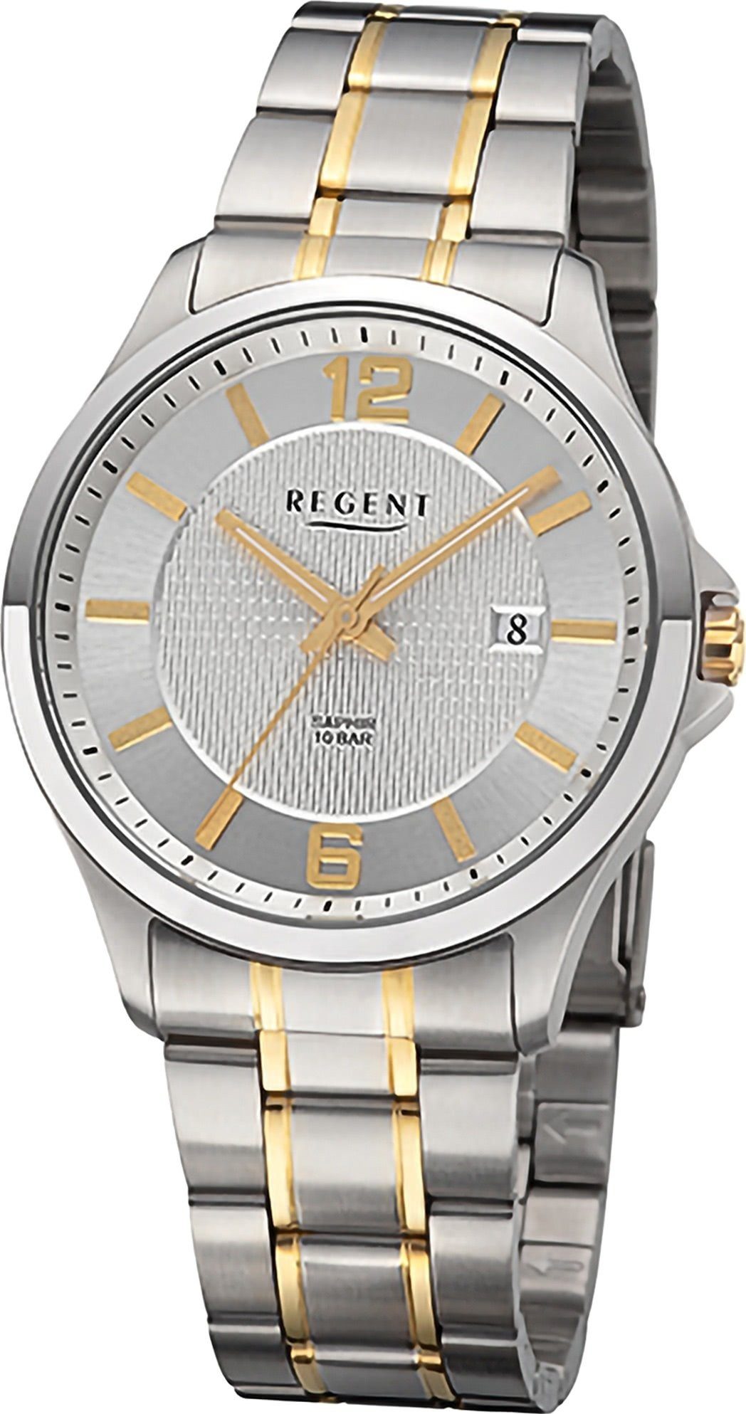 Die Casual Uhr der Marke Regent hat ein schönes Armband aus Metall in silber gold mit Faltschließe. Eine Uhr aus der Regent Metallarmband Kollektion für Herren in der Gehäusefarbe silber gold mit Quarzwerk. Die Analoguhr mit Saphirglas hat ein Zifferblatt in der Farbe silber. Die Form der Uhr ist rund und das Gehäuse ist mittel ca. 39mm im Durchmesser.