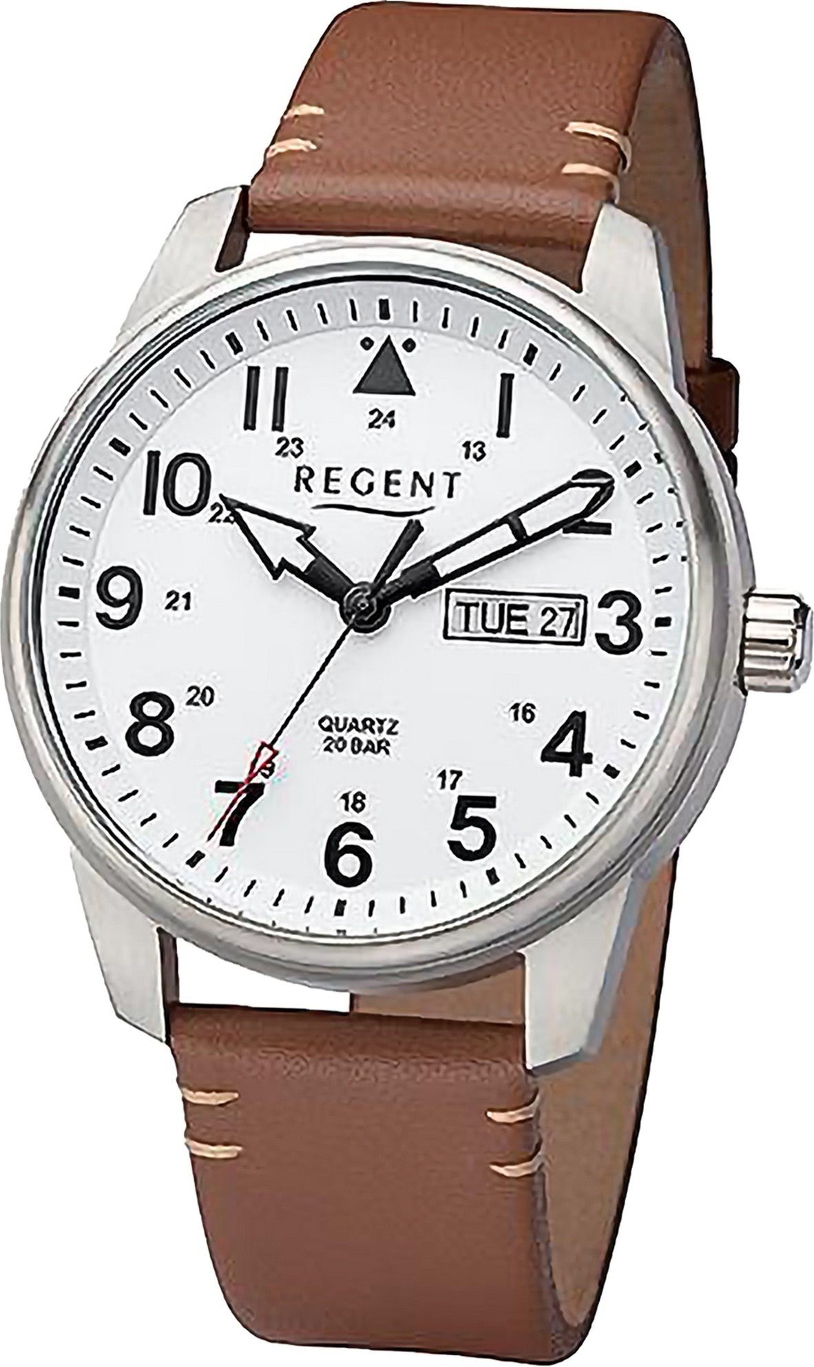 Die Casual Uhr der Marke Regent hat ein schönes Armband aus Leder in braun hellbraun mit Dornschließe. Eine Uhr aus der Regent Lederarmband Kollektion für Herren in der Gehäusefarbe silber mit Quarzwerk. Die Analoguhr mit Mineralglas hat ein Zifferblatt in der Farbe weiß. Die Form der Uhr ist rund und das Gehäuse ist groß ca. 40,5mm im Durchmesser.