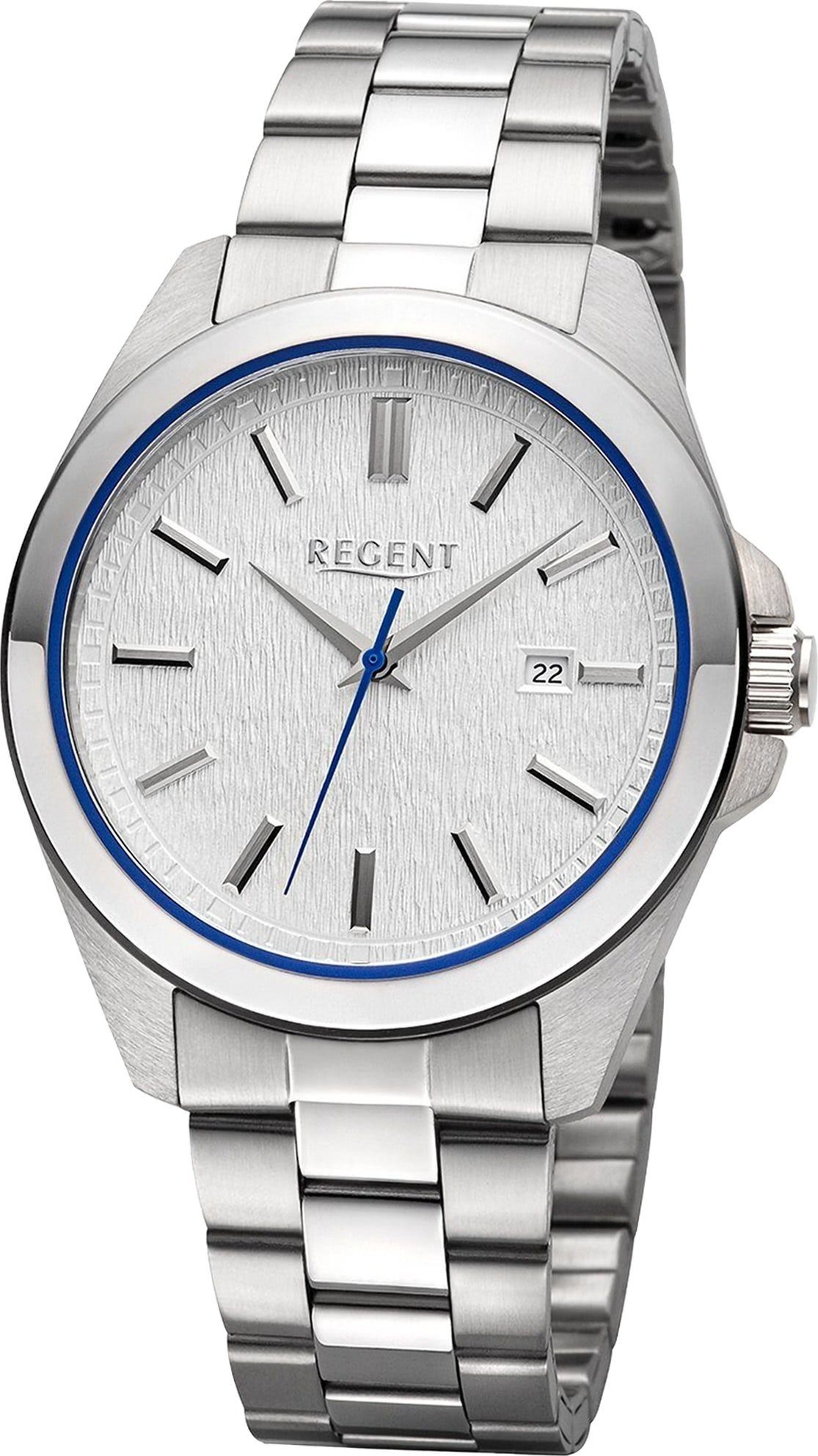 Die Casual Uhr der Marke Regent hat ein schönes Armband aus Metall in silber mit Faltschließe. Eine Uhr aus der Regent Metallarmband Kollektion für Herren in der Gehäusefarbe silber mit Quarzwerk. Die Analoguhr mit Mineralglas hat ein Zifferblatt in der Farbe silber-blau. Die Form der Uhr ist rund und das Gehäuse ist groß ca. 41mm im Durchmesser.
