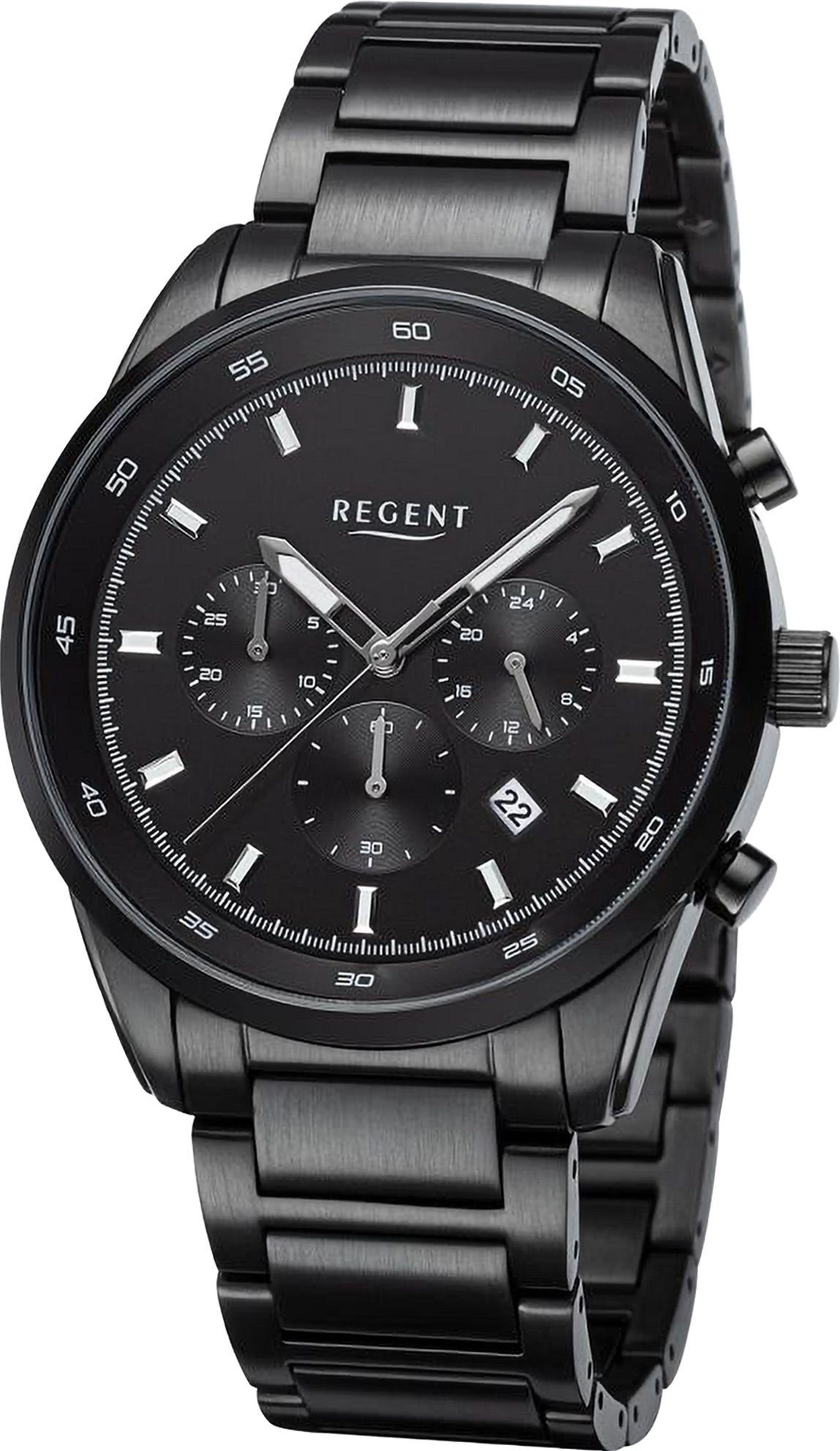 Die Casual Uhr der Marke Regent hat ein schönes Armband aus Metall in schwarz mit Faltschließe. Eine Uhr aus der Regent Metallarmband Kollektion für Herren in der Gehäusefarbe schwarz mit Quarzwerk. Die Analoguhr mit Mineralglas hat ein Zifferblatt in der Farbe schwarz. Die Form der Uhr ist rund und das Gehäuse ist groß ca. 44mm im Durchmesser.