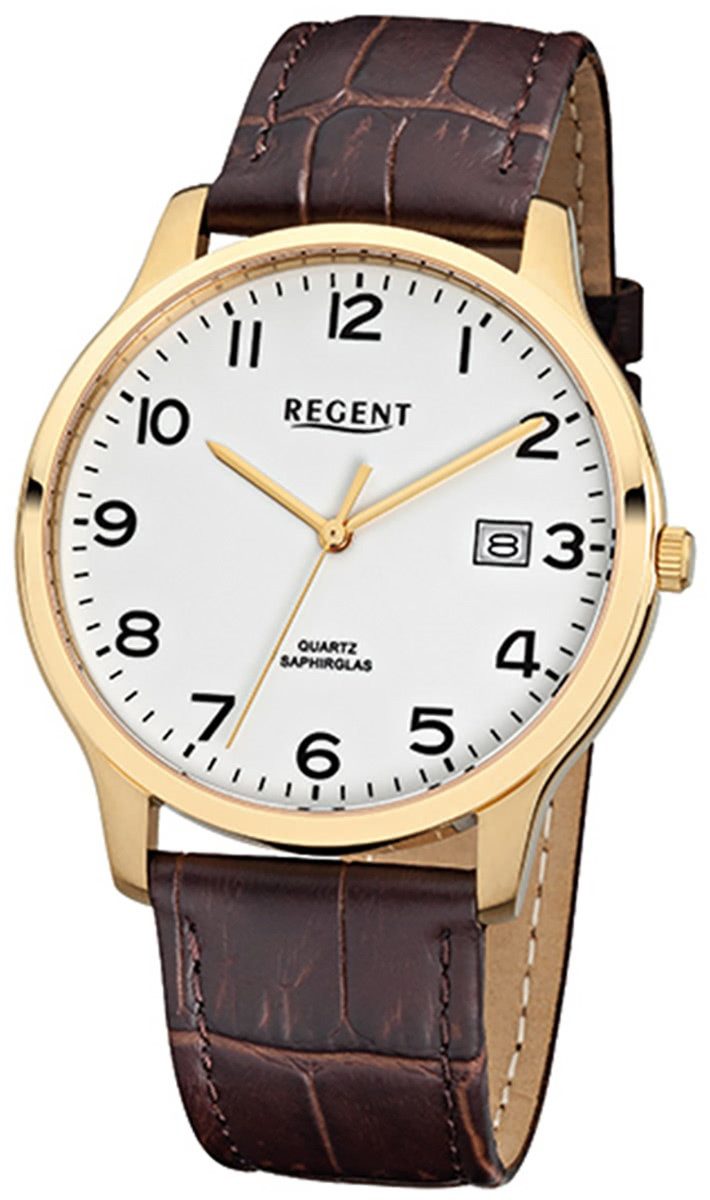 Die Elegant Uhr der Marke Regent hat ein schönes Armband aus Leder in braun mit Dornschließe. Eine Uhr aus der Regent Lederarmband Kollektion für Herren in der Gehäusefarbe gold mit Quarzwerk. Die Analoguhr mit Saphirglas hat ein Zifferblatt in der Farbe weiß. Die Form der Uhr ist rund und das Gehäuse ist mittel ca. 39mm.